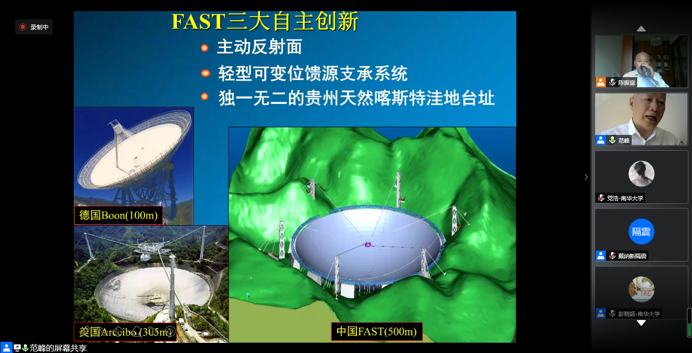 上午9:00,由哈尔滨工业大学范峰教授作学术报告,题目为《500口径巨型望远镜FAST(天眼)结构关键问题研究》,伟德国际1946陈振富书记主持。范教授先介绍了“巨型望远镜FAST”项目并引出了建设中最重要的结构系统,然后详细讲述了FAST主动反射面结构总体方案、关键技术和30m模型试验三个方面的内容。讲解采用工程实践与理论相结合的方式,包扩了从结构的选型到模型的建立和优化,从各方面结构性能的影响分析到健康监测和故障诊断。最后范教授对师生提出的一些疑问进行详细解答,并指出我国正处于从建造大国到建造强国的发展阶段,土木工程起着重要作用,未来也非常光明,希望我们土木学子积极投身建设事业,为国家做贡献。