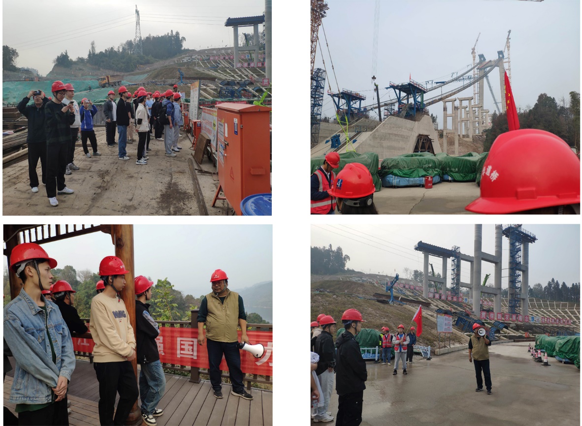 项目部副总工程师易继武和现场技术人员带领师生分别参观了大桥官庄岸高边坡防护工程、重力式锚碇、大桥主缆和引桥墩柱等项目现场,从项目概况、施工工艺、现场管理、新材料应用等方面进行讲解,并细心为学生现场答疑解惑。