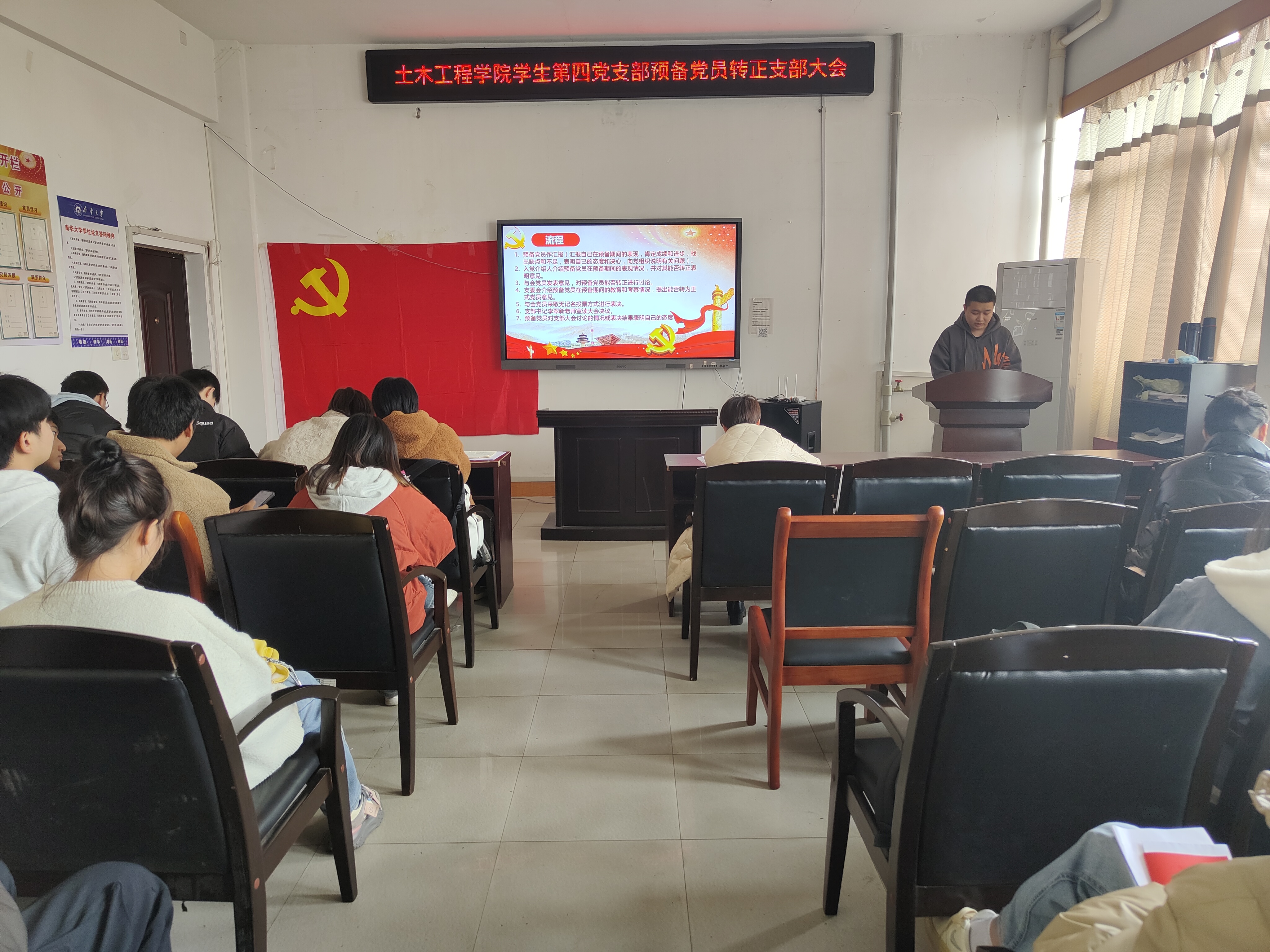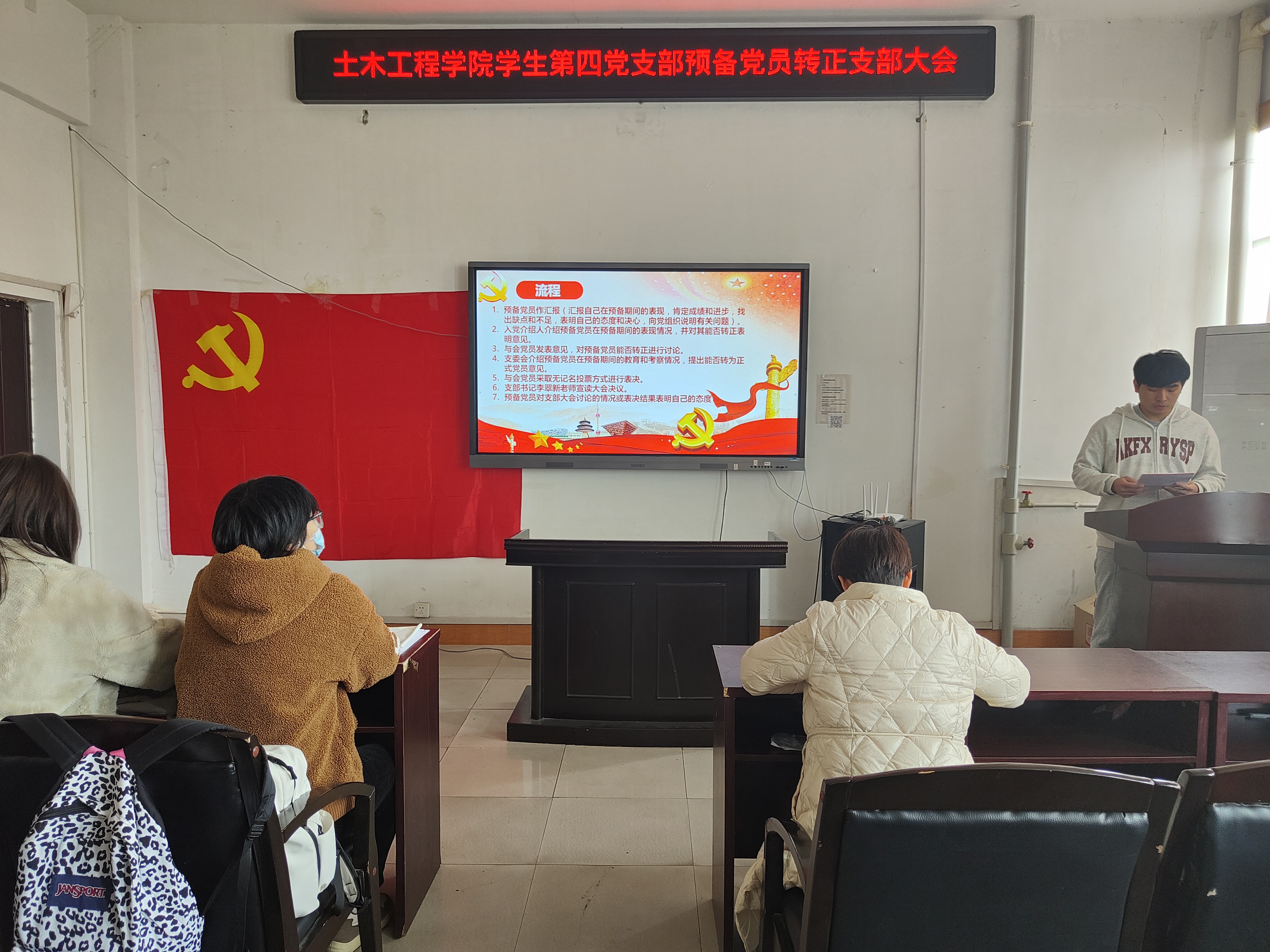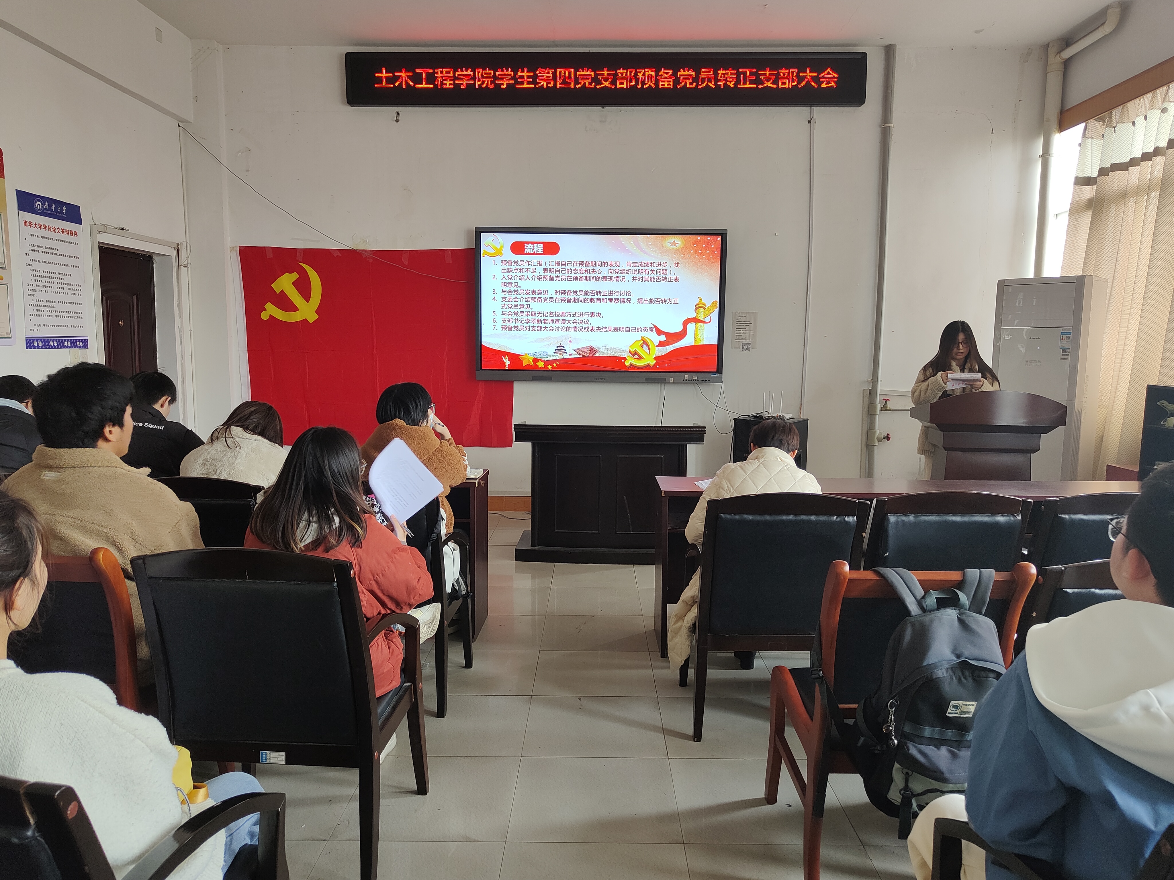 首先,全体起立,奏唱国歌。接着,王沾城等6名预备党员逐一汇报自己在预备期间思想、学习、工作、生活等方面的情况,入党介绍人介绍了对预备党员的培养、教育和考察情况,并提出其能否转正为正式党员的意见,其他与会党员也充分讨论,提出意见。