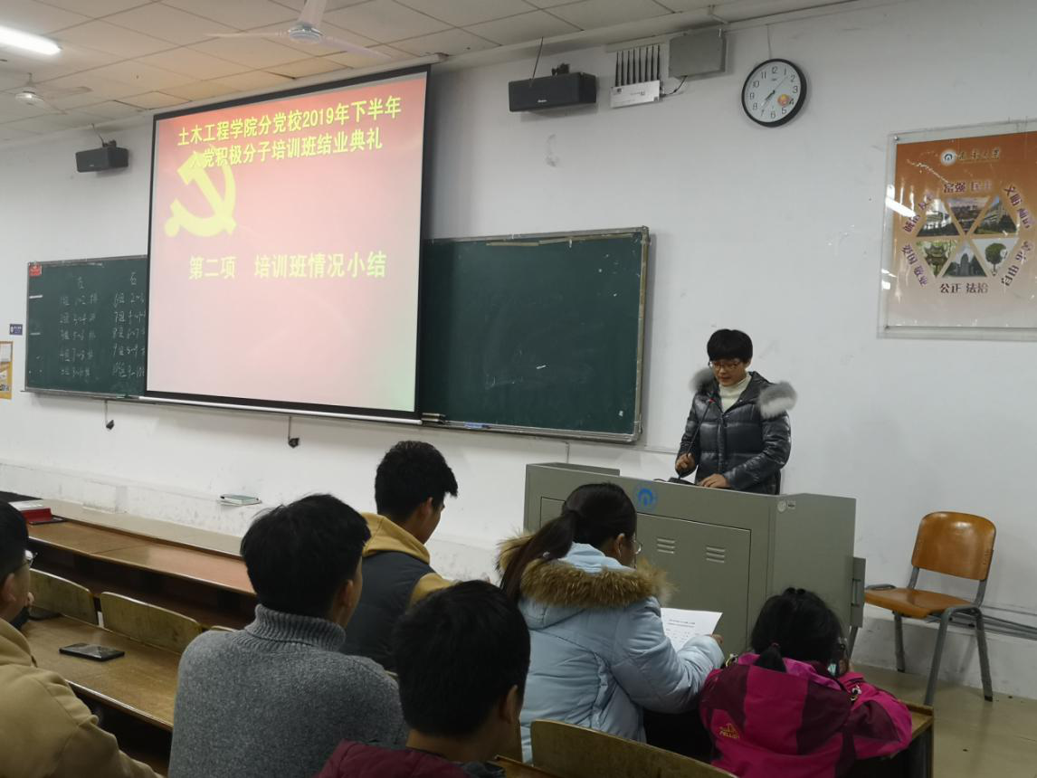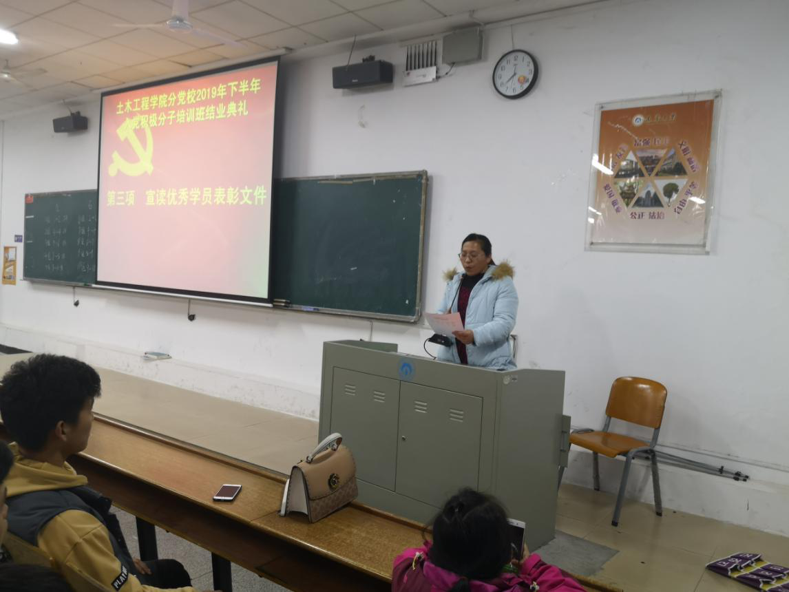 2019年12月19日19:30,伟德国际1946分党校于一教112召开了2019下半年入党积极分子培训班结业典礼。学生党支部书记李翠新老师、彭兴明老师、刘华老师以及本期培训班全体学员参加了结业典礼。典礼由李翠新老师主持。
