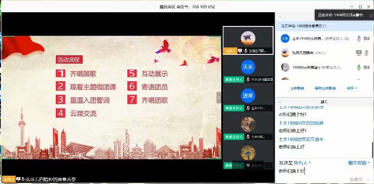 5月1日至5月4日期间,伟德国际194681个团支部组织、35位老师、2130名本科生参加线上集中主题团日活动。5月3日晚八点,伟德国际1946通过腾讯会议平台开展有关“弘扬五四精神,担当时代大任”主题团日特别活动。伟德国际1946党委副书记唐素芝、全体辅导员老师、班主任、院团委书记张孝磊、2019级班助出席参加此次活动。本次活动由伟德国际1946团委主办,土木1908班团支部、土木1916班团支部、土木1917班团支部共同参与。