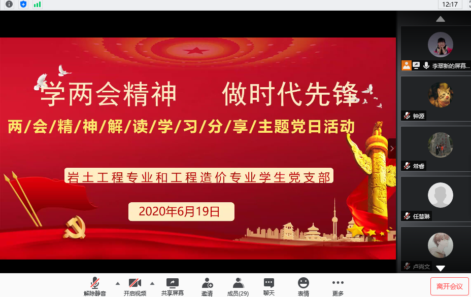 为认真学习贯彻落实两会精神,进一步深化学生党员对两会精神的认识与理解,强化学生的政治责任感和历史使命感,2020年6月19日下午,伟德国际1946岩土工程专业和工程造价专业学生党支部通过腾讯会议平台开展“学两会精神,做时代先锋”线上主题党日活动,活动由支部书记李翠新老师主持,支部全部党员参加。