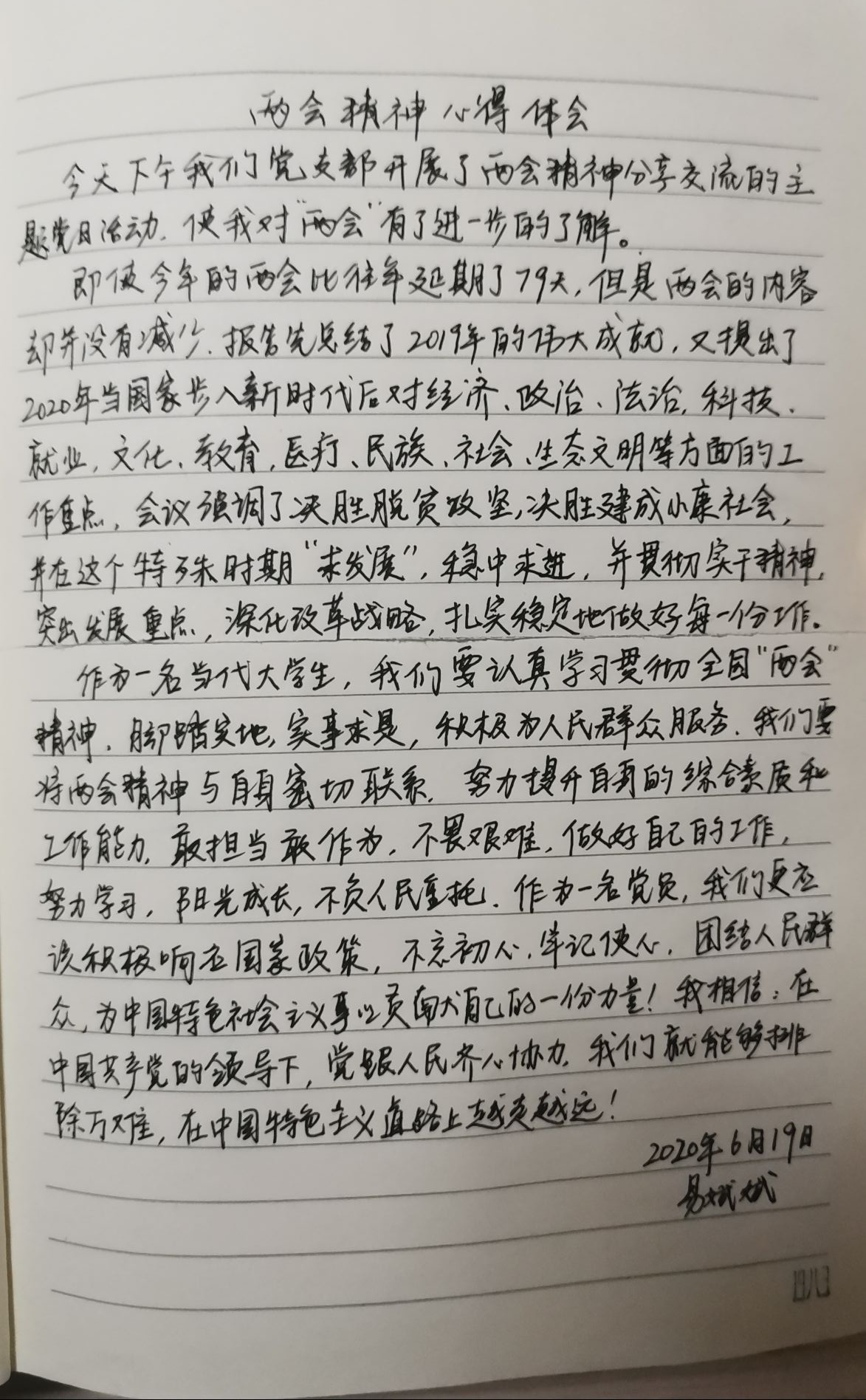 活动伊始,支部书记李翠新老师带领全体党员从认识两会开始,了解了2020年两会的不平凡。随后,刘璐瑶、李玉海、谢倩兰三位同志与大家分享了自己关于两会的学习内容和关注热点。他们分别围绕脱贫攻坚、政府工作报告、民法典等两会热点话题进行了解读学习与分享。会上,支部书记还认真组织学习了创建全国文明城市、国家卫生城市的有关要求和知识,讲解了“衡阳群众”APP操作使用知识,引导全体党员在今后的生活中积极参加志愿者活动,支持、参与创文创卫工作。全体党员按要求加入了“衡阳群众”学校团队。最后,李老师强调,全体党员要全方位多角度地继续学习、领会、贯彻两会精神,扬青春之气,发奋斗之力,以两会精神为指引,主动担当作为,努力学习,心怀家国,做新时代的新青年,为祖国建设献一份力。会后,全体党员围绕本次主题党日活动撰写心得体会。