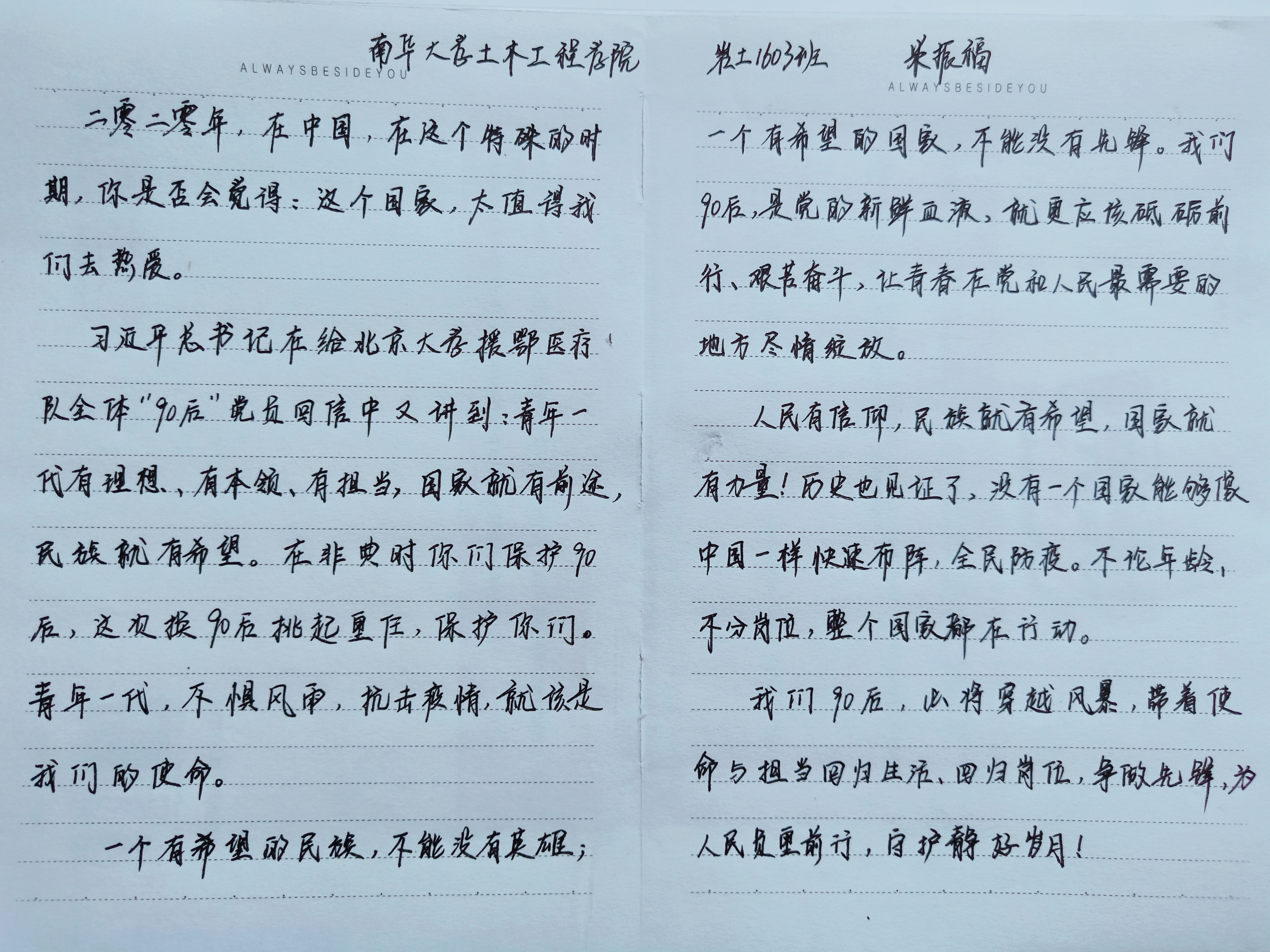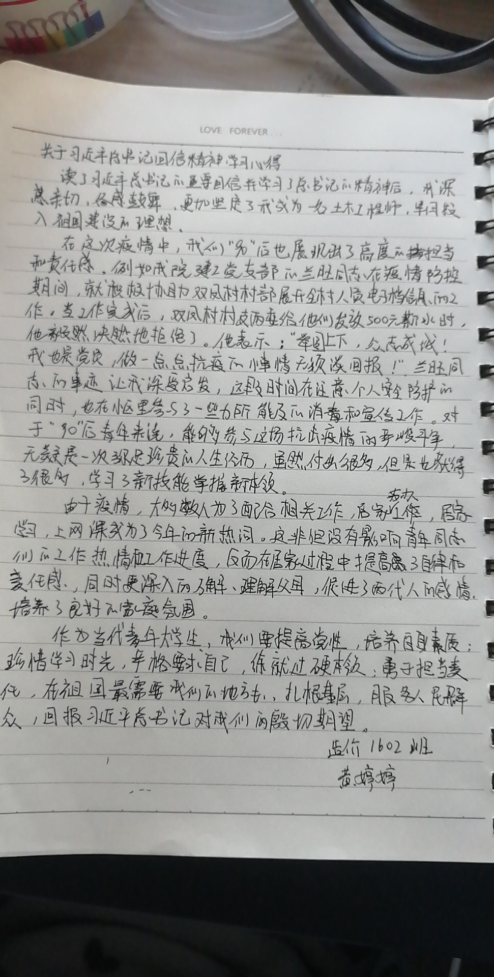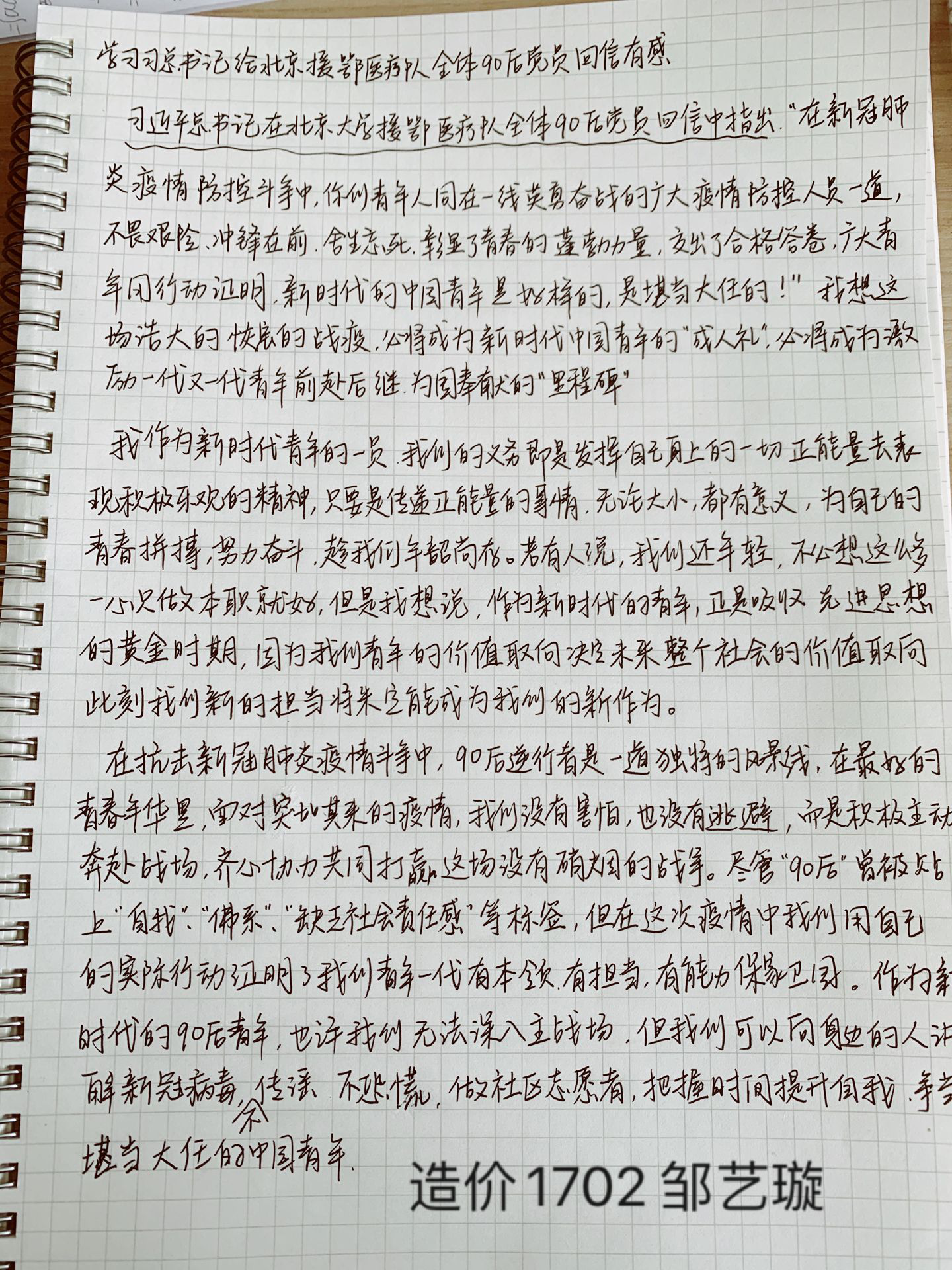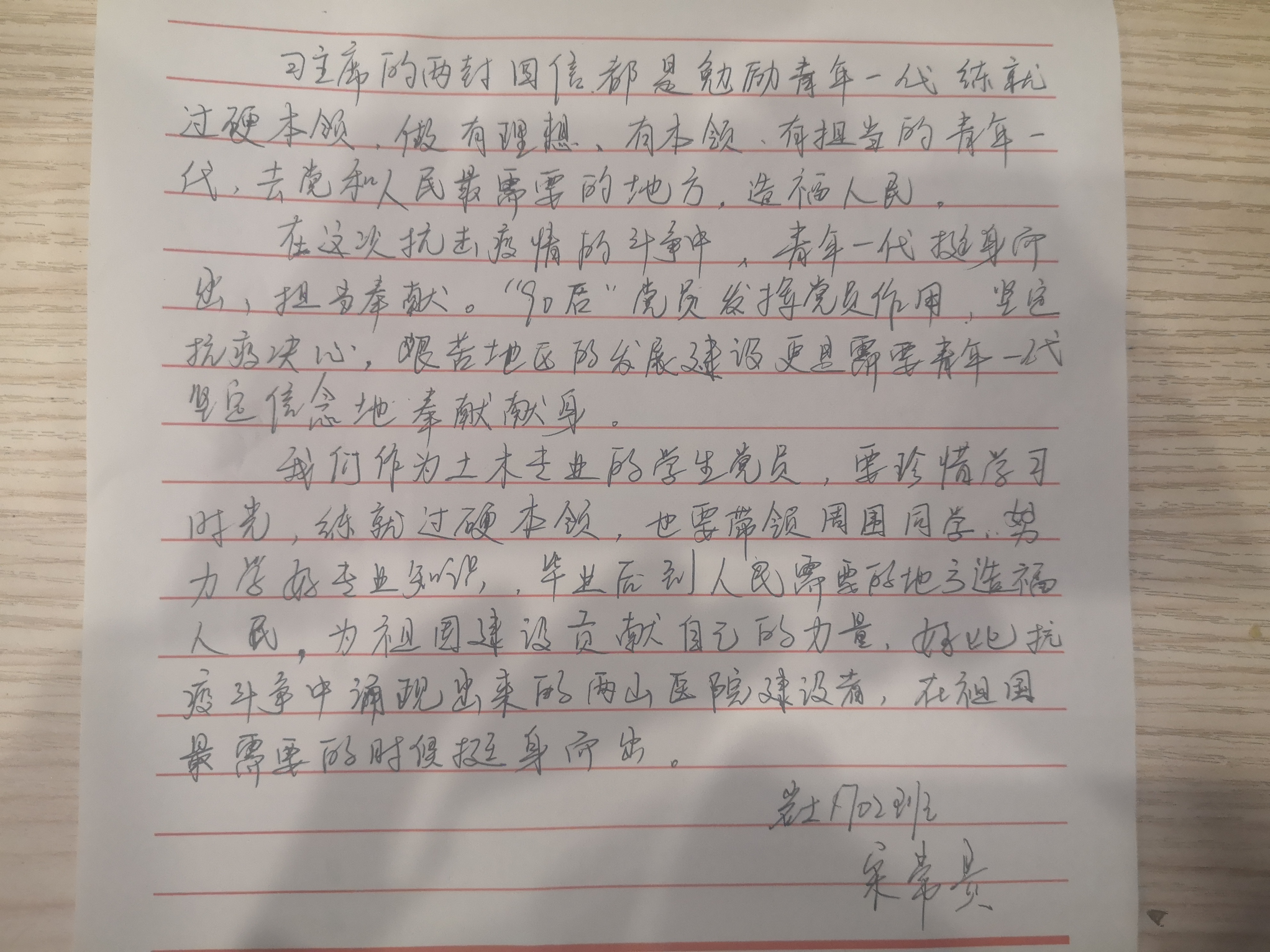 在支部书记李翠新老师的带领下,支部全体党员首先认真阅读并学习回信全文,领会回信精神,随后全体党员纷纷发言,畅谈学习回信的体会、感悟和奋斗决心。他们表示,总书记的回信读后令人倍受鼓舞,在这场疫情防控阻击战中,火神山、雷神山医院迅速拔地而起,土木人用行动展现了中国速度,今后将珍惜学习时光,努力学习专业知识,练就过硬本领,做好一块砖,哪里需要哪里搬,为祖国的建设贡献自己的力量。李老师最后总结道:总书记的回信饱含对全体青年的肯定、关怀和希望,在今后的学习、工作和生活中,希望青年党员切实把总书记的谆谆教导和殷切希望内化于心,外化于行,筑梦理想,苦练本领,勇于担当,书写青春华章。