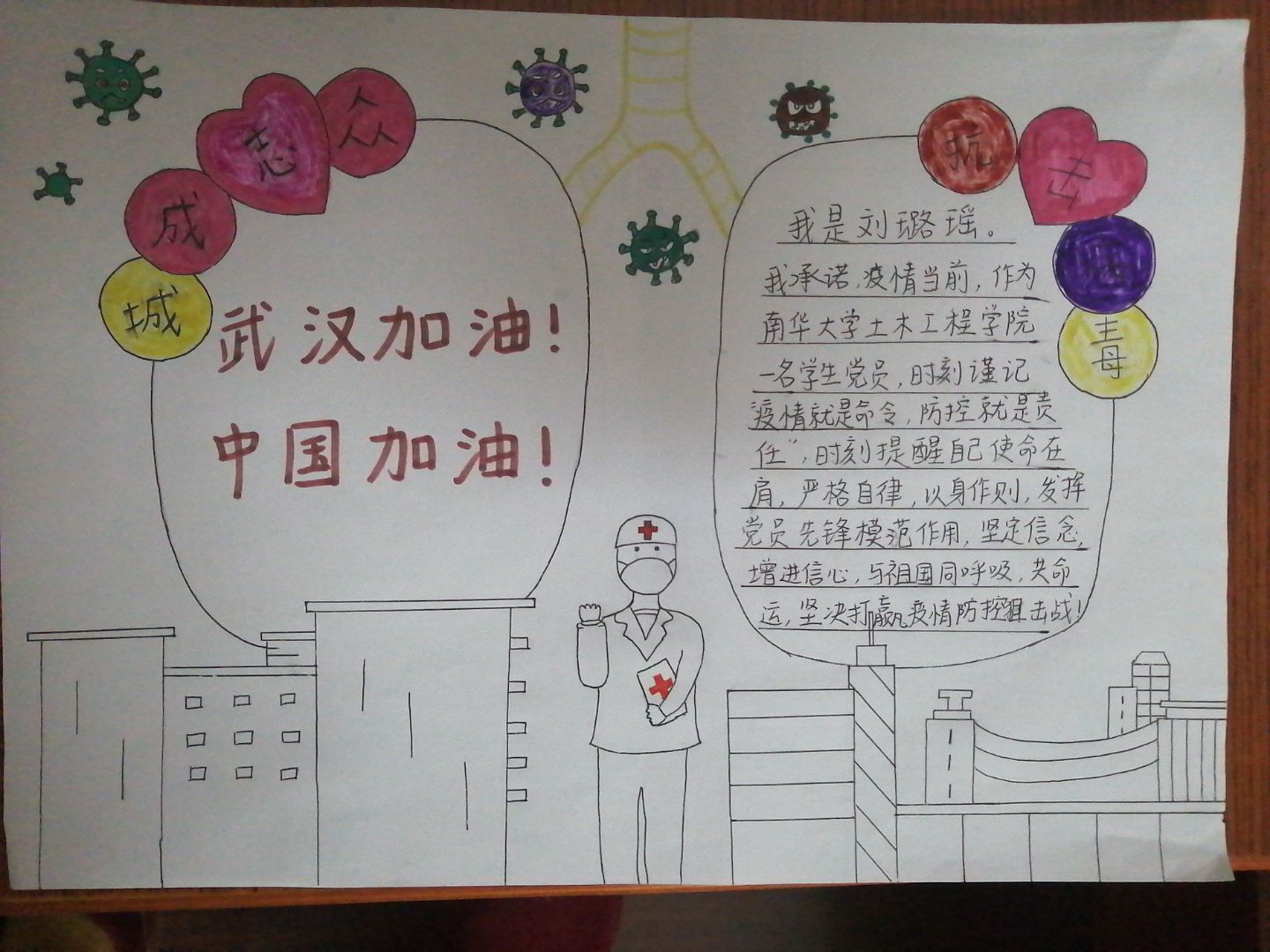 会议分为四部分:首先,李老师带领全体党员学习了习近平总书记在统筹推进新冠肺炎疫情防控和经济社会发展工作部署会议上的讲话精神。随后开展线上交流讨论,与会党员联系实际,交流分享自己的所见、所思、所悟、所行。有的党员分享了自己宣传疫情防控信息的经历,有的分享了身边的感人故事,大家踊跃发言,围绕当前疫情防控、毕业生就业及毕业设计、网课学习等一系列问题提出切实可行的建议。之后,李老师总结到:这场没有硝烟的防疫战让我们深刻认识到中国特色社会主义制度的优势,切实感受到强大的中国力量;青年学生要坚定理想信念,树立正确的人生导向,厚植家国情怀,把自身命运和国家社会利益紧密结合在一起。希望学生党员不忘初心、牢记使命,发挥好指挥员、宣传员、示范员、联络员的作用,积极配合学校、学院做好各项工作,主动帮助班干部做好“每日一报”、“每日健康打卡”、线上教学学风管理等工作,宅而不荒,合理安排学习与生活,切实帮助、服务身边同学。最后,各位党员同志晒出了精心制作的承诺书手绘图、视频、绘画等抗疫作品,为武汉加油,为中国加油。