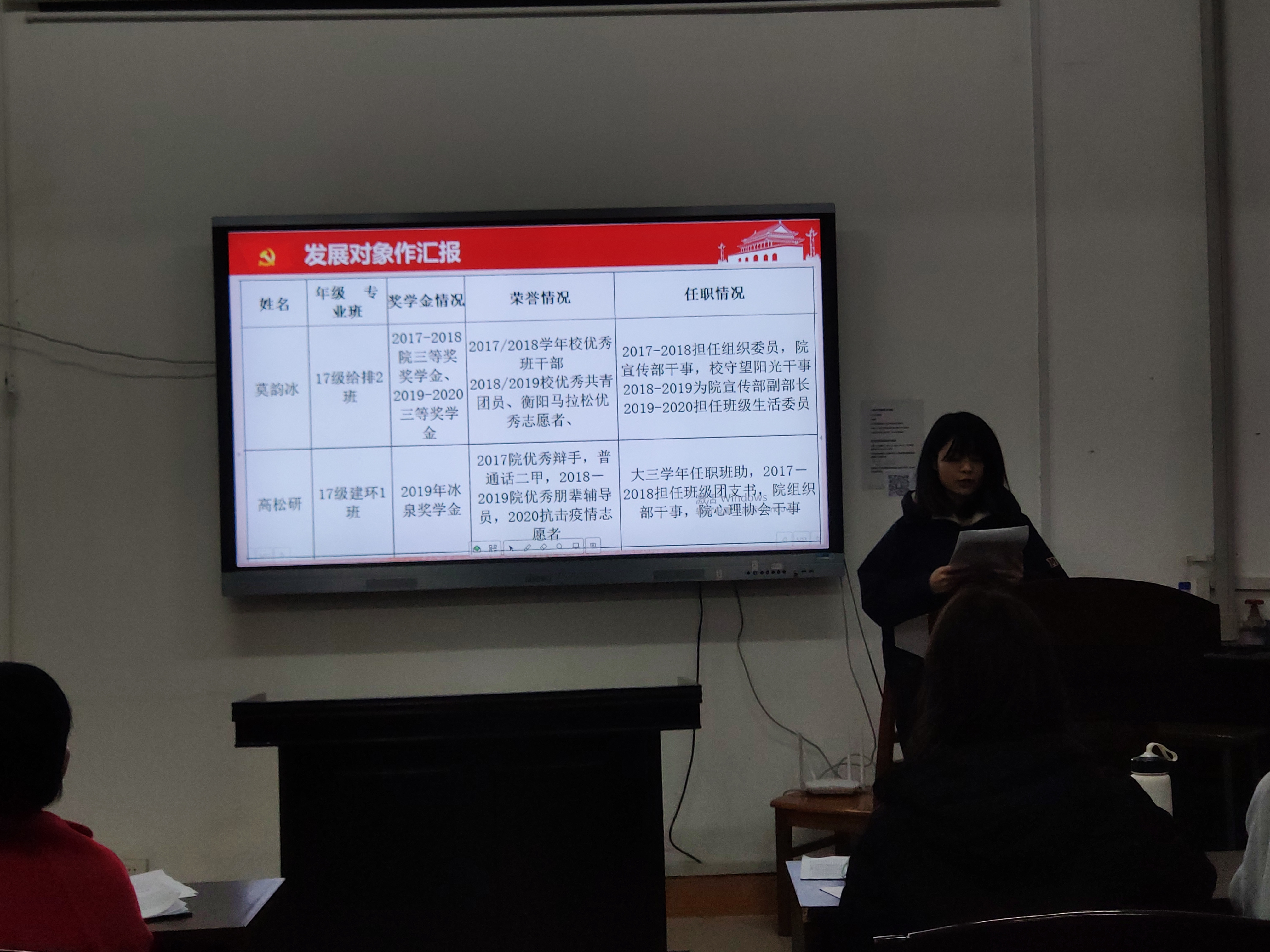 2020年11月27日下午16:30,伟德国际1946给排建环学生党支部在土木楼四楼会议室召了预备党员吸收会议,党支部全体党员以及于仁杰、黄雅琴等13名拟预备党员参与会议。本次会议由向金晶同志主持。
