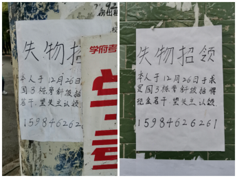 2020年12月26日中午,伟德国际1946给排水科学与工程专业1701班殷文同学在北校求是园三栋旁边斜坡路拾得现金三百余元(现金裹在一起掉在地上),拾得现金后他一直在原地等待失主。等待许久失主没来,于是他返回宿舍写了3张失物招领,并张贴于丢失处电线杆以及斜坡上下处的电箱上,同时将失物招领信息上传到党队失物招领群等待失主的电话。等待几日仍未找到失主,殷文同学并未放弃,于12月31日联系辅导员贺淑珍老师寻求解决办法,希望能尽快找到失主。