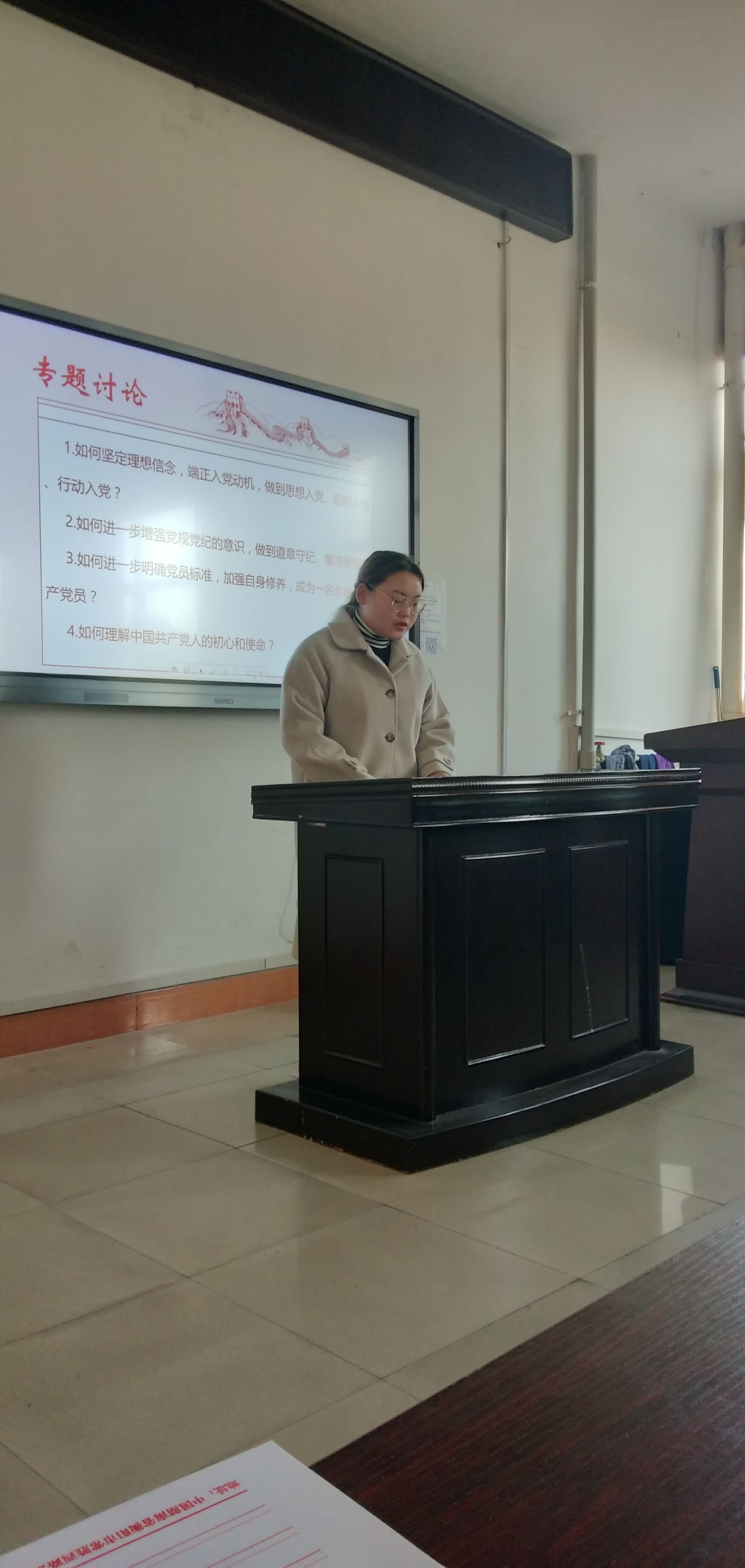 此次专题讨论围绕“如何坚定理想信念,端正入党动机,做到思想入党、组织入党、行动入党”、“如何进一步增强党规党纪的意识,做到遵章守纪、廉洁修身”、“如何进一步明确党员标准,加强自身修养,成为一名合格的共产党员”、“如何理解中国共产党人的初心和使命”四个主题展开。首先是分小组自由讨论,然后各小组代表总结发言,各支部的学员们提到,新时期大学生发展对象在思想上、行动上要积极跟随党的脚步,贯彻落实习近平新时代中国特色社会主义思想,坚持四个意识、四个自信,坚定理想信念,坚守入党初心,坚持党性原则,加强自我约束,不折不扣执行党的纪律和规矩,充分发挥先锋模范作用,努力向党组织靠拢,争取早日成为一名优秀的共产党员。