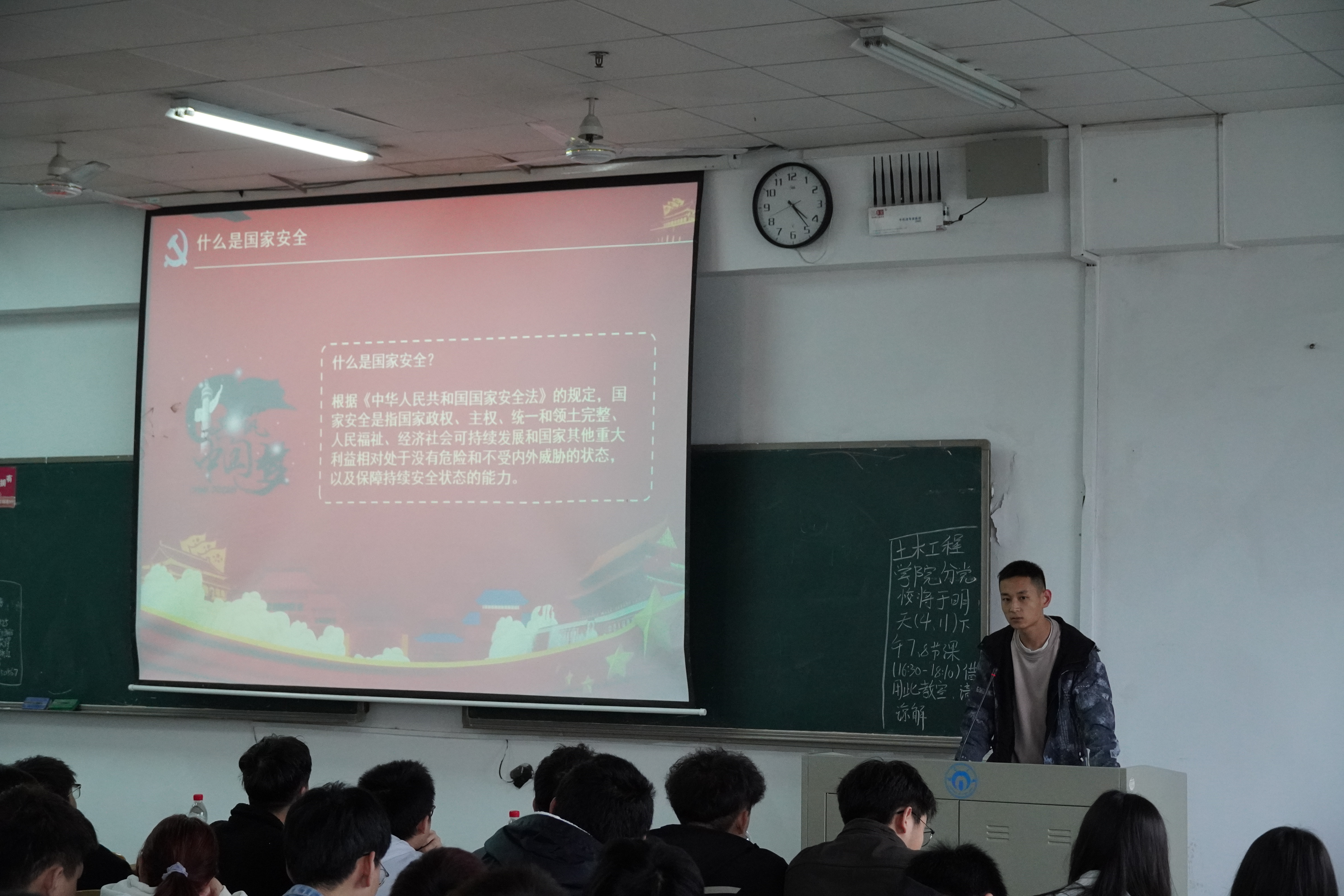 活动伊始,两位班长强调了国家安全的重要性并列举了相关案例来详细讲述,给同学们普及国家安全相关知识,其中,着重强调了“国家利益,高于一切,保密责任,重于泰山”。同时,通过四个与国家安全相关的视频,让同学们了解到了我国国家安全现状以及应对间谍行为的相关措施。最后,同学们共同学习了《中华人民共和国反间谍法》和《中华人民共和国刑法》等法律法规,明确了危害国家安全的行为及相关罪名。