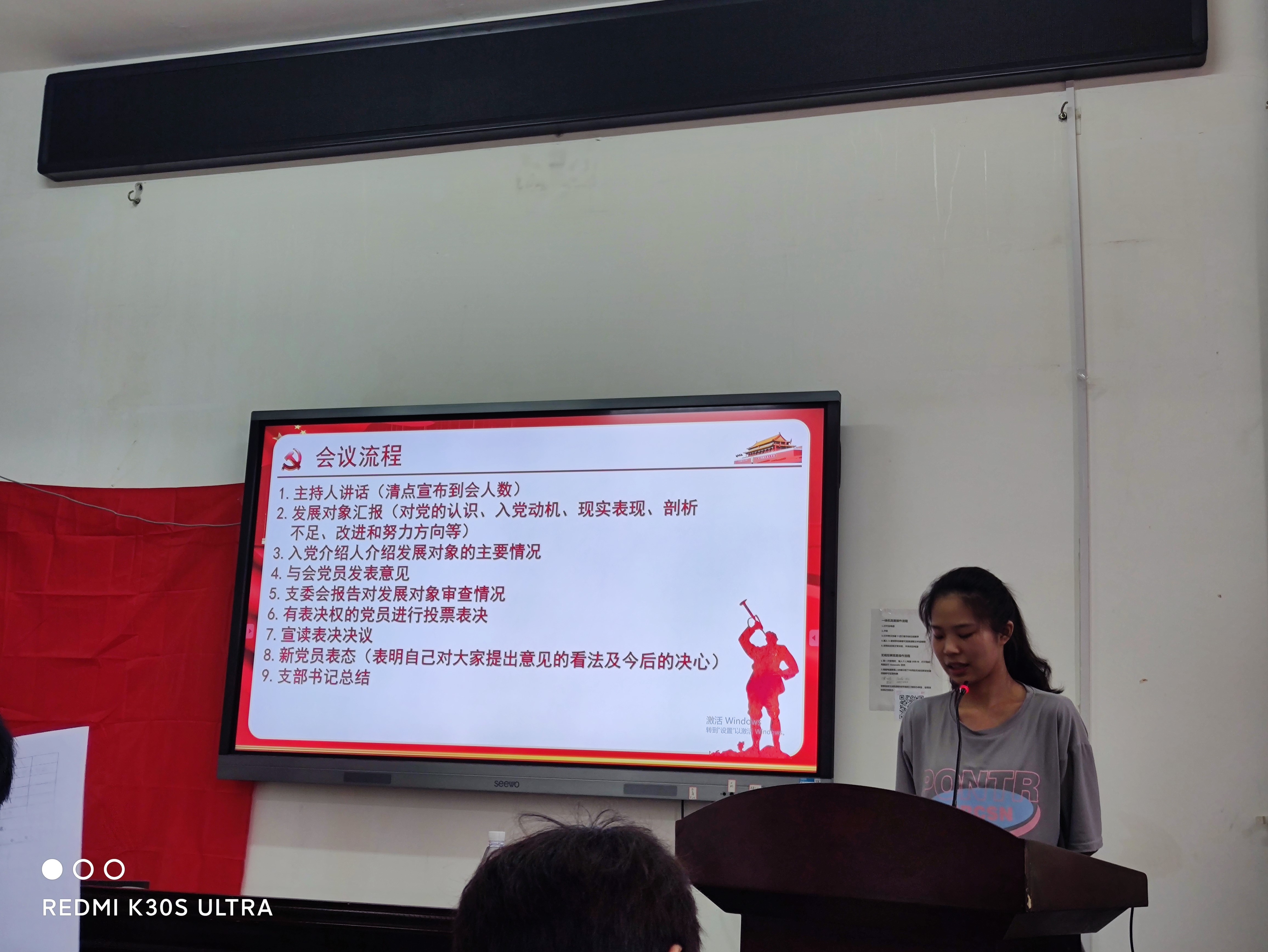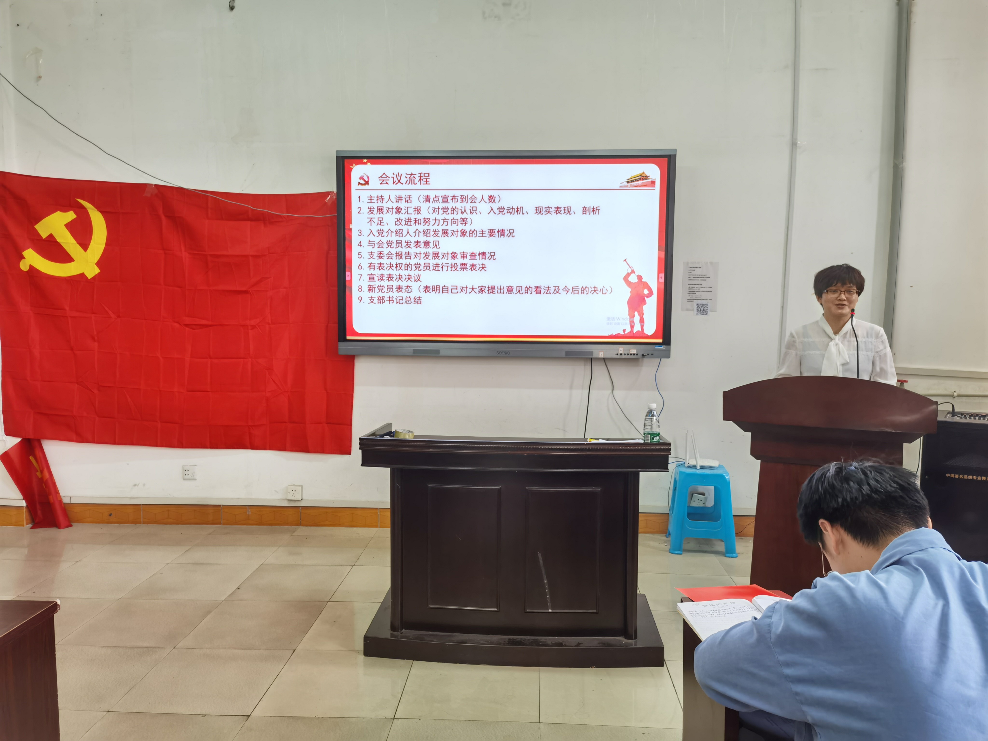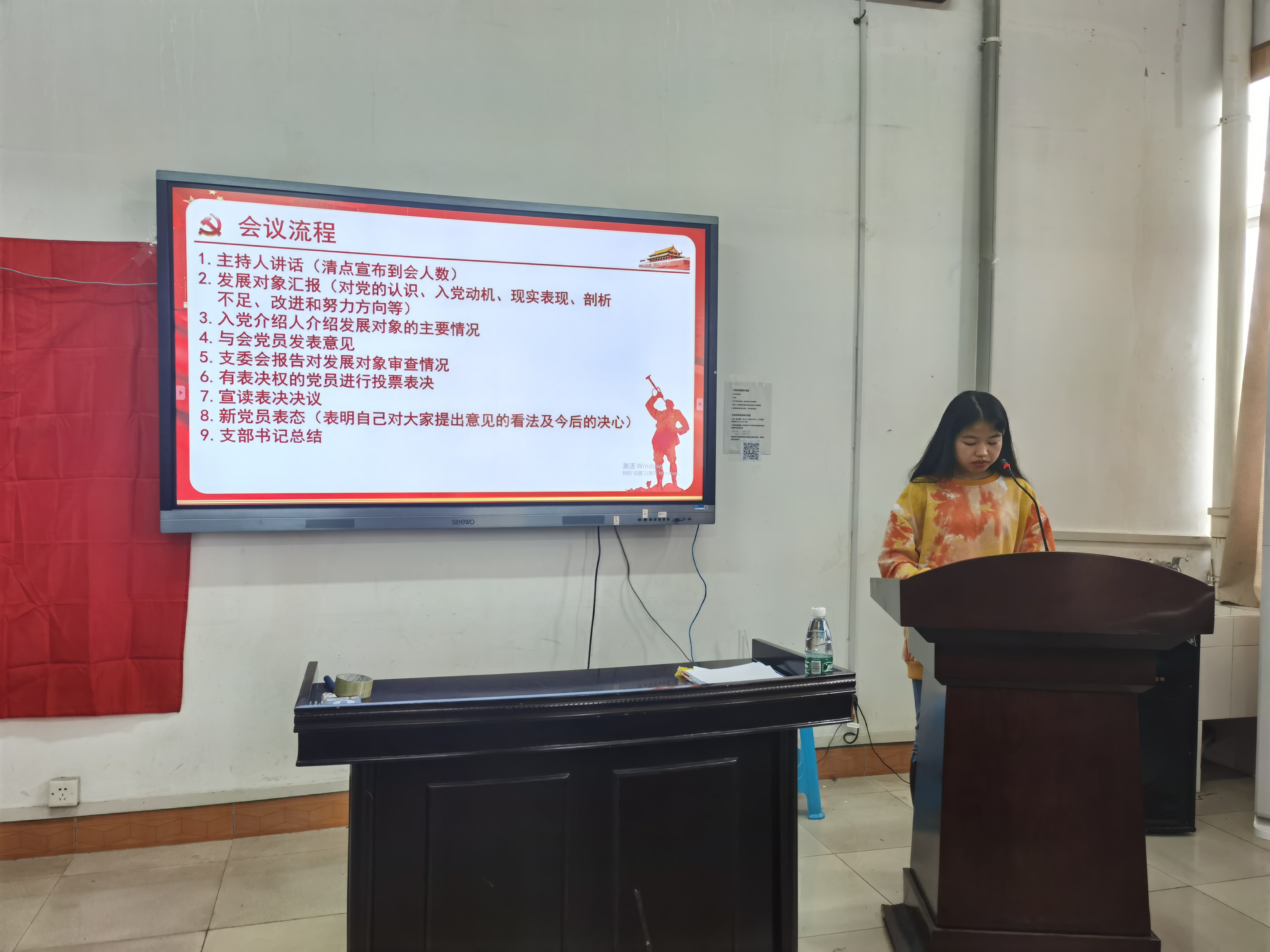会议严格按照组织党员发展程序进行,整场会议气氛严肃认真。首先,主持人向大会报告人数、并简要介绍大会流程。发展对象依次上台汇报自己对党的认识、入党动机、现实表现等方面的情况。随后,由入党介绍人介绍发展对象的有关情况,着重针对他们目前存在的不足之处提出建议,并对其能否入党表明态度。接着,支部副书记屈海朋代表支委会向大会报告对张育凡等21名同志的审查情况。与会党员同志们踊跃发言,实事求是,对发展对象能否入党进行讨论并发表意见。经与会正式党员投票表决,一致同意吸收张育凡等21名同志为中共预备党员。新党员随后一一表态,表达自己今后努力的方向、前进的决心。