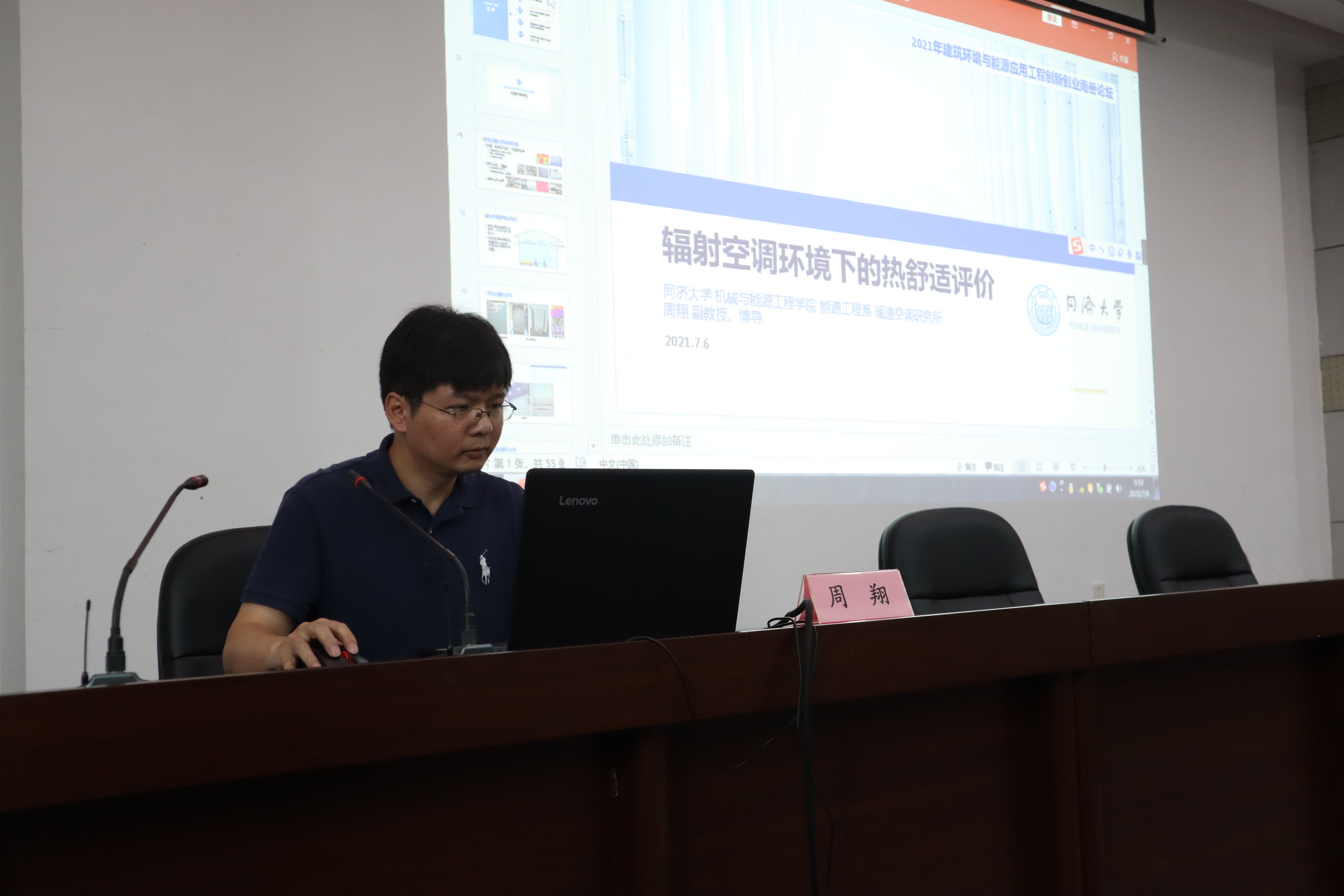 紧接着,由同济大学的周翔教授就辐射空调方面的研究作报告。他向大家介绍了辐射空调系统和辐射空调技术的发展,并指出辐射空调技术发展对不对称辐射环境热舒适理论提出了新的要求。此外,他还介绍并讲解了室内平均辐射温度场、室内不对称辐射温度场计算工具和辐射环境热舒适预测工具等专业知识,引导同学们在专业领域做创新研究。