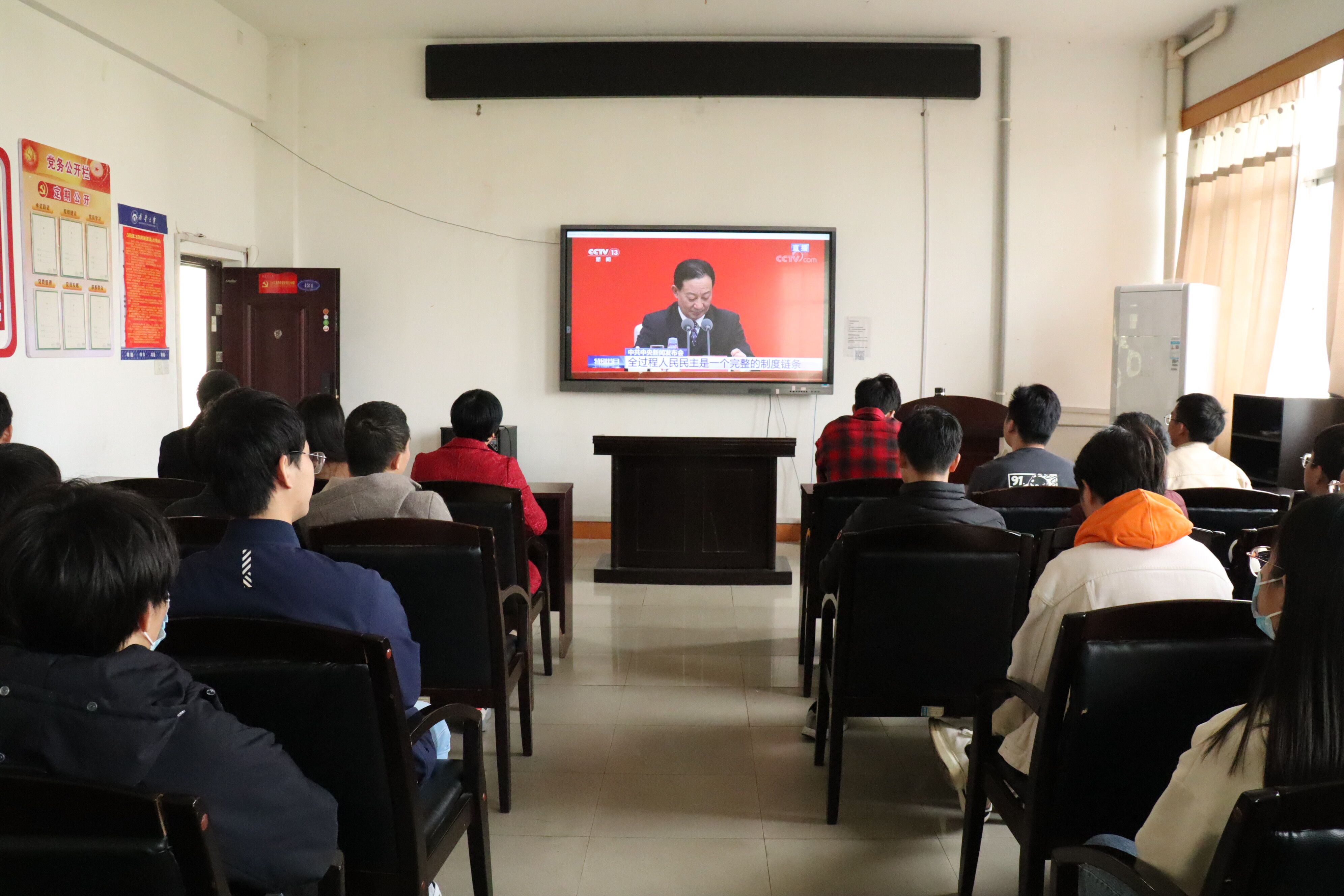 2021年11月12日上午10点,伟德国际1946各学生党支部于土木楼二楼和四楼会议室组织观看第十九届六中全会新闻发布会直播,院党委副书记唐素芝、辅导员贺淑珍、彭兴明与同学们一同观看了此次直播。