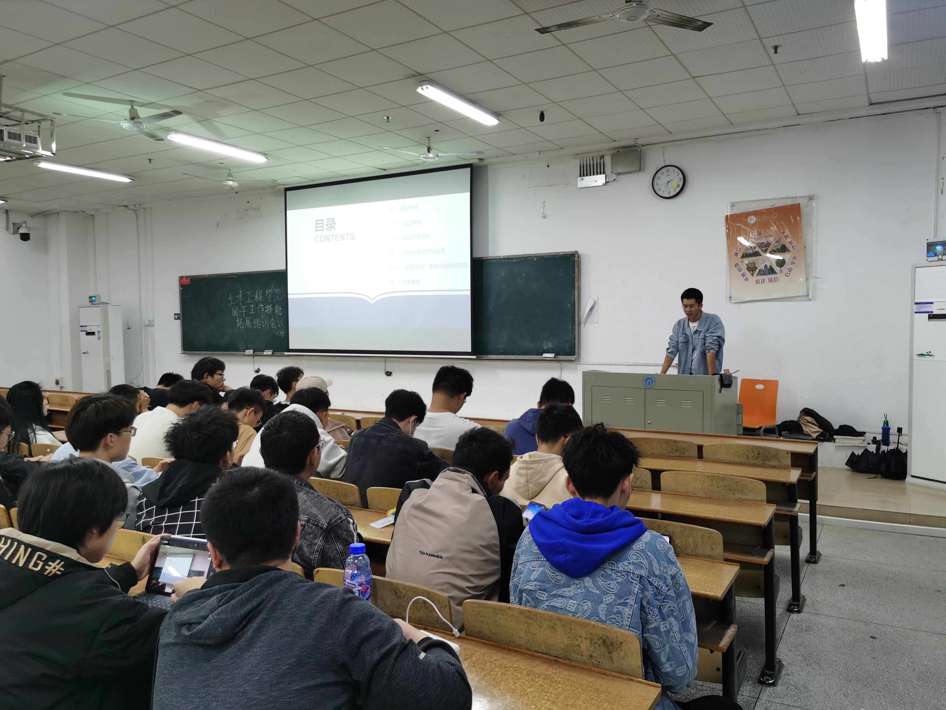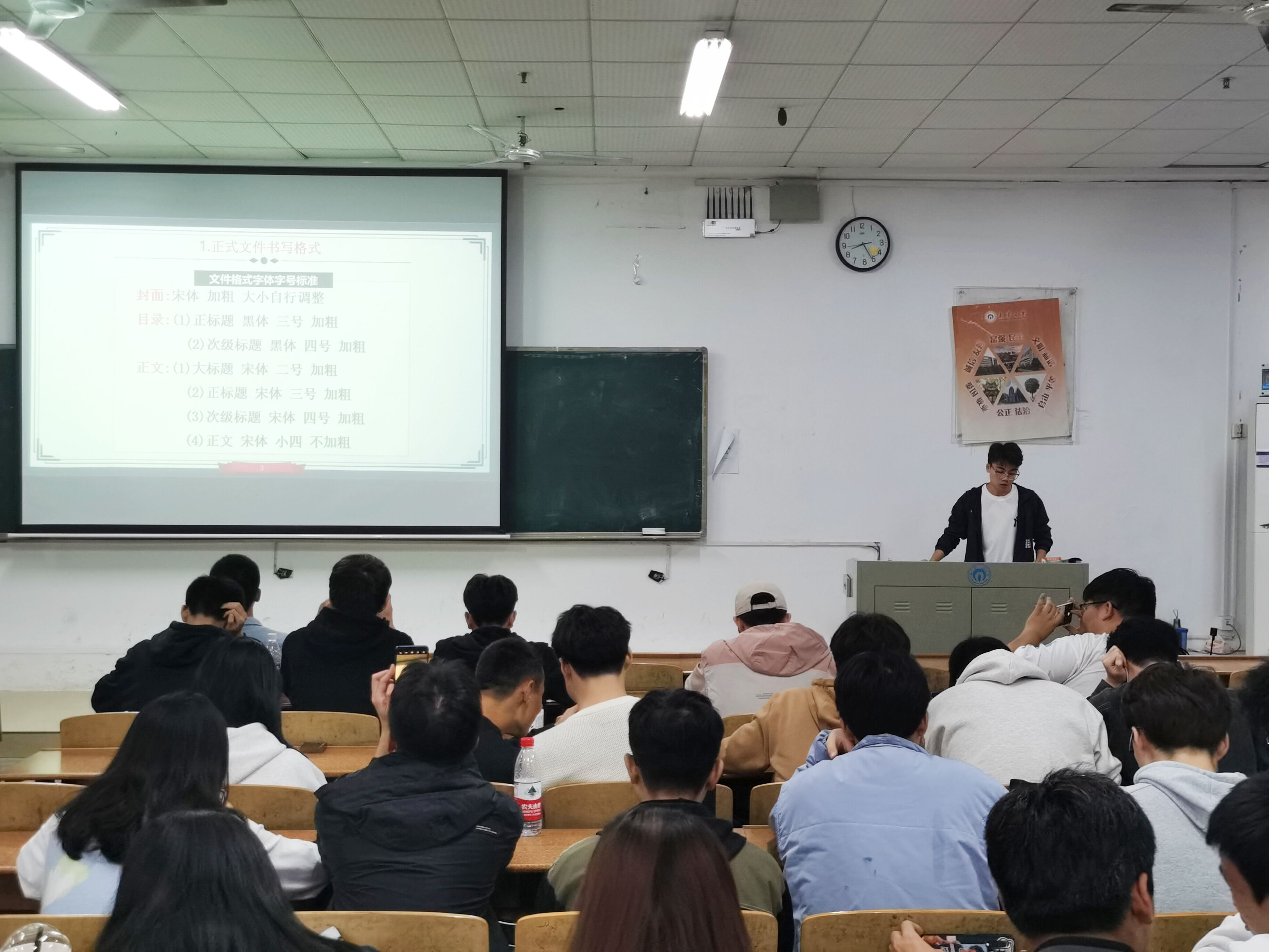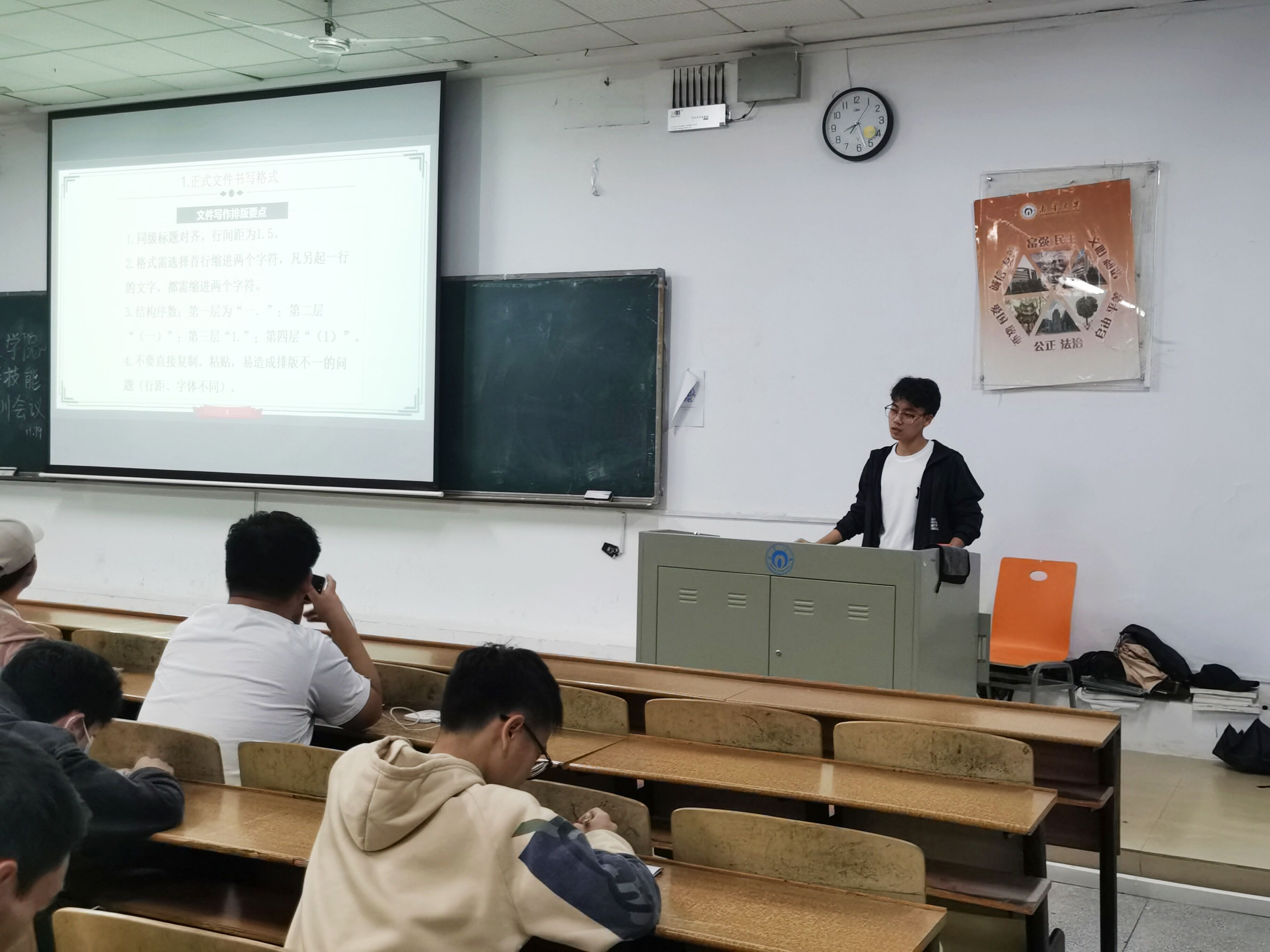 会议伊始,梁华康强调了此次培训会议的重要性。接着,由梁华康为大家培训到梦空间相关技能,他为大家解读第二课堂文件,内容主要包括积分定义及达标标准、结果应用和活动积分认定标准。随后,梁华康对我院第二课堂运行机制暨活动发布流程进行说明由活动前期的准备,活动的发布与考核,再到最后的签到发分与活动总结,所有环节梁华康都进行了全面的叙述。梁华康二课培训结束后,学生会宣传部部长顾梓晗进行文书培训。顾梓晗先从字号、排版要点及标题规范三方面强调正式文件书写格式。随后,顾梓晗为大家讲解工作计划、工作总结、申请和会议记录这四种常见文书的书写要求。在场的团干们专注听讲,认真笔记。会议最后,梁华康对本次会议重要内容再次强调。至此,培训会议圆满结束。
