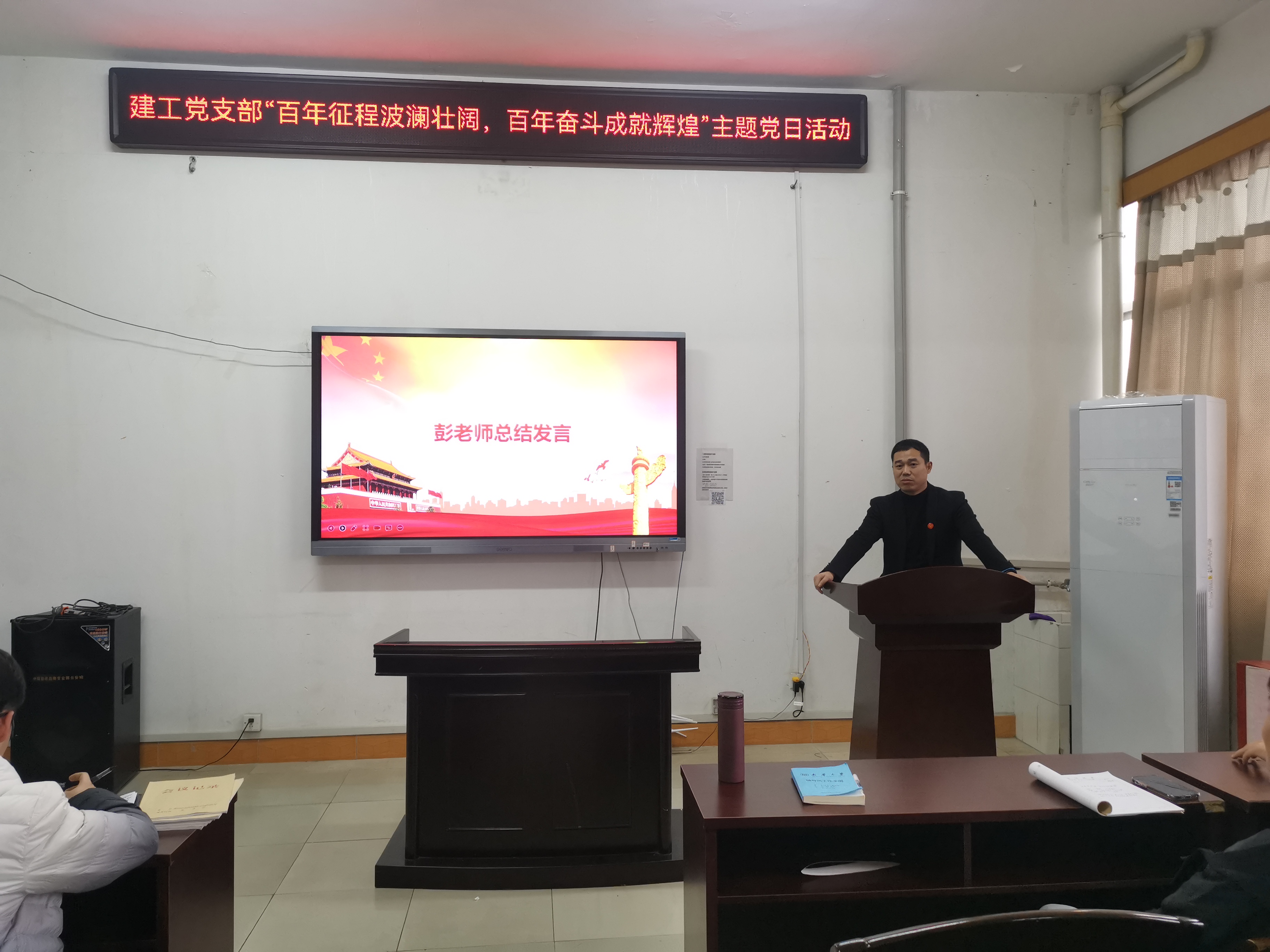 会议最后,支部书记彭兴明老师对会议进行总结。彭兴明老师说道:建党100周年,中国共产党慢慢的站起来了,我们年轻党员一代必须肩负起历史的伟大使命。希望学生党员同志们不负厚望。