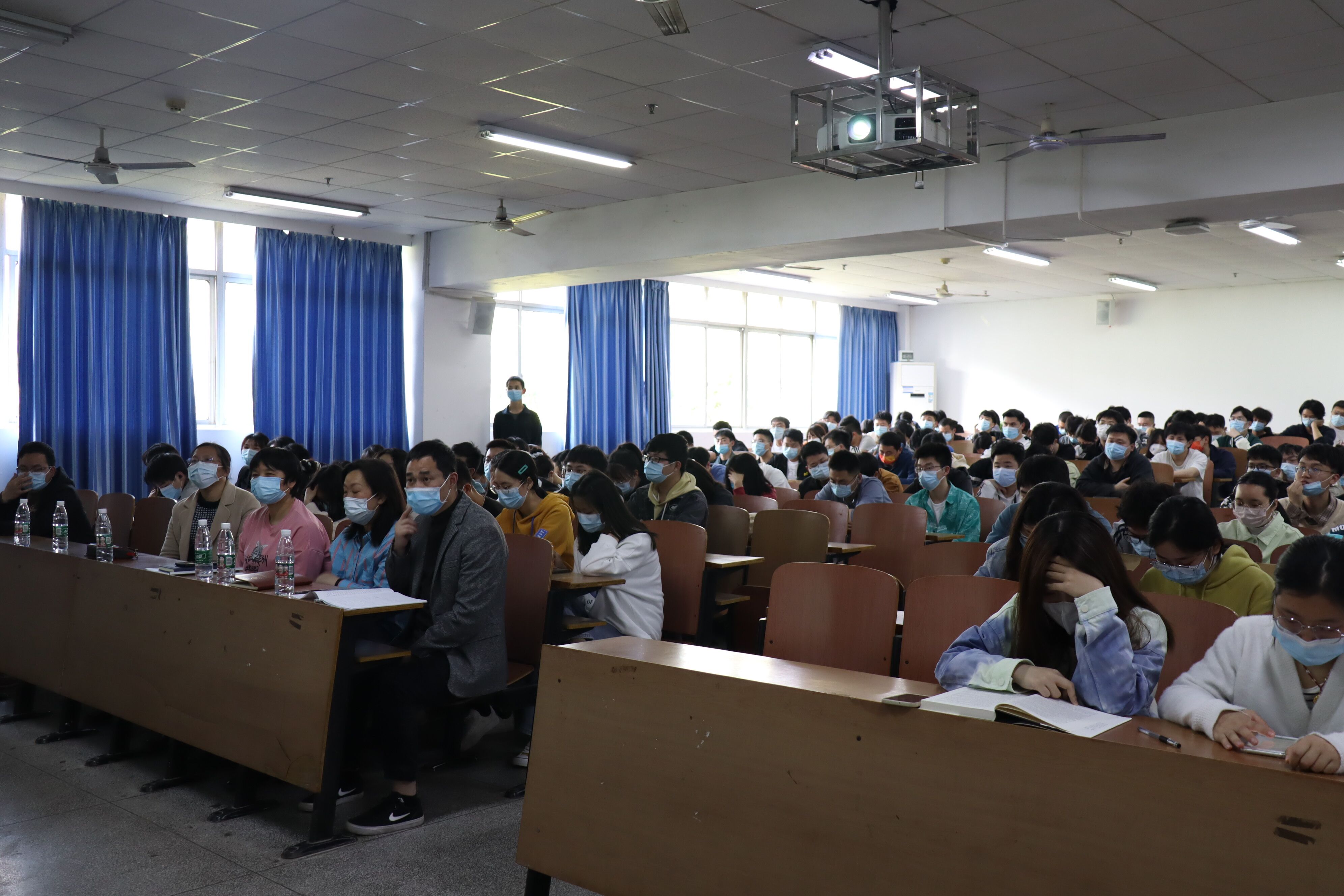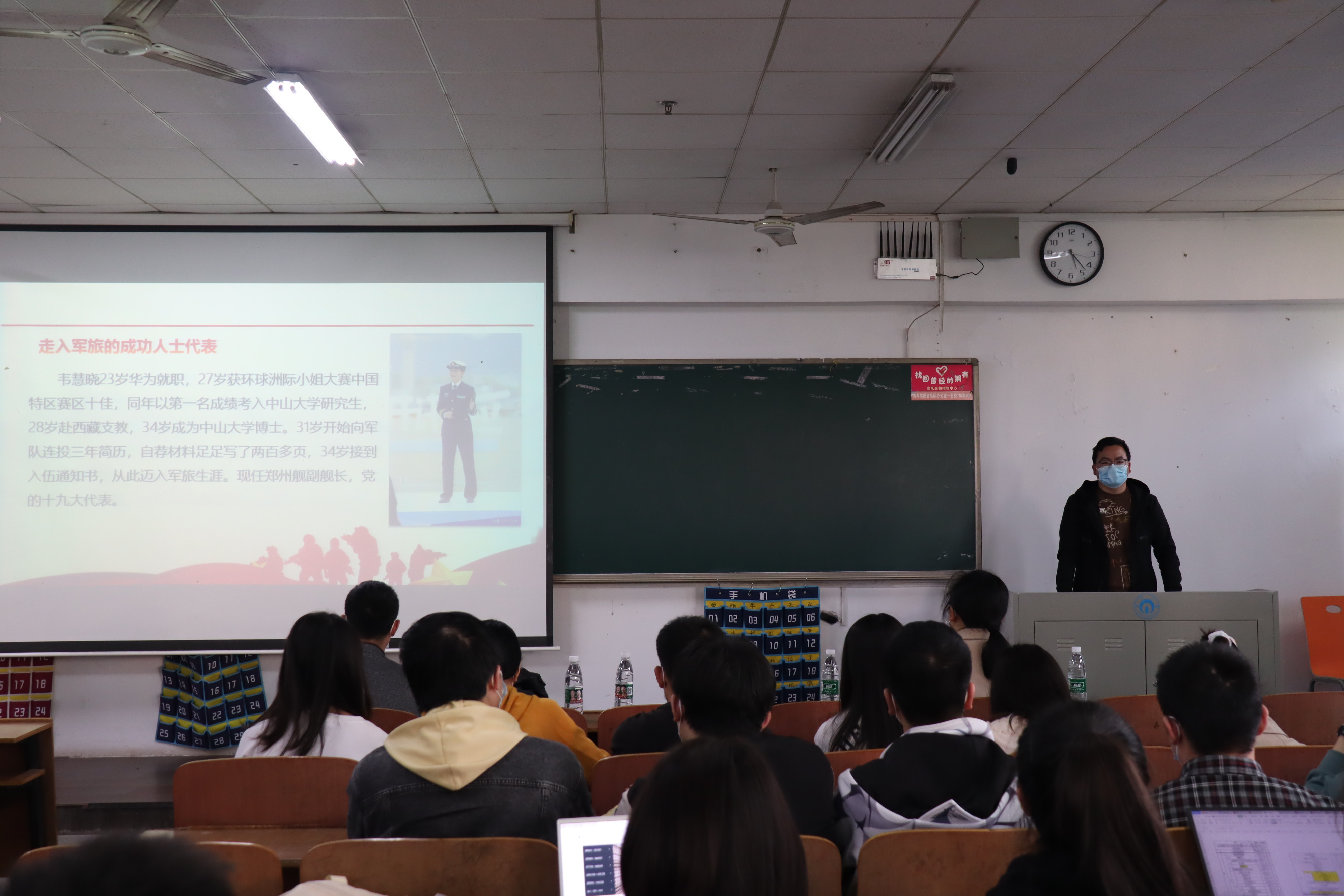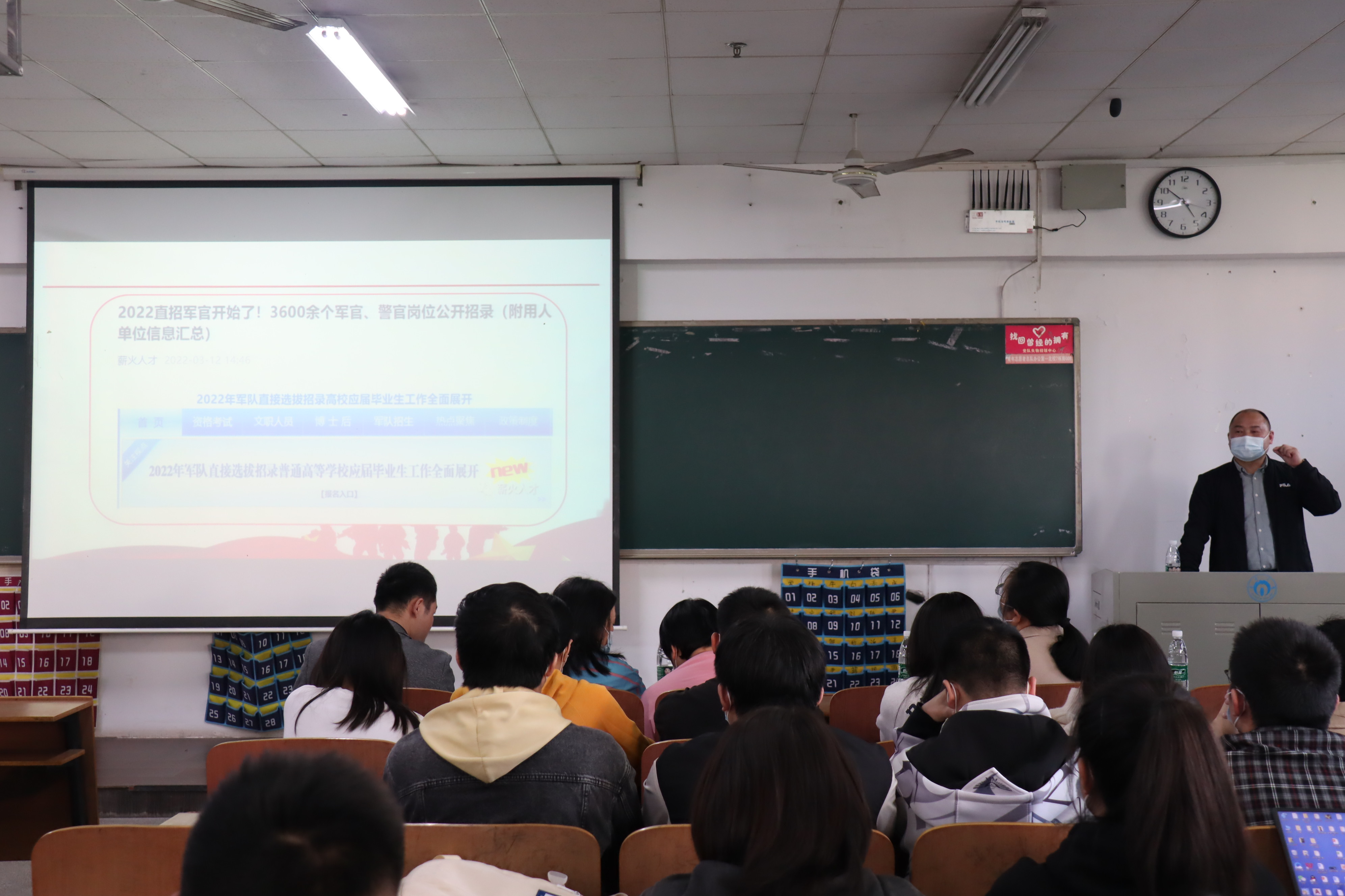 会议伊始,汪先利老师从意义和政策两个基本点出发发表征兵宣讲,着重向大家介绍军旅生活对自身价值实现的帮助和入伍相关的优惠政策,介绍了入伍经济补偿、个人发展、学业激励、晋升通道、士兵提干等各个方面的相关政策,详尽地解释了有关入伍流程、报名方法等一系列有关信息,为同学们提供了许多独到的建议。同时,他把个人思想、能力上的进步作为着眼点,鼓励同学们入伍,去军营锻炼自己。接着,吴旦老师讲话,对汪先利老师耐心细致的讲解表示感谢,并希望学生们能积极报名参军,报效国家。
