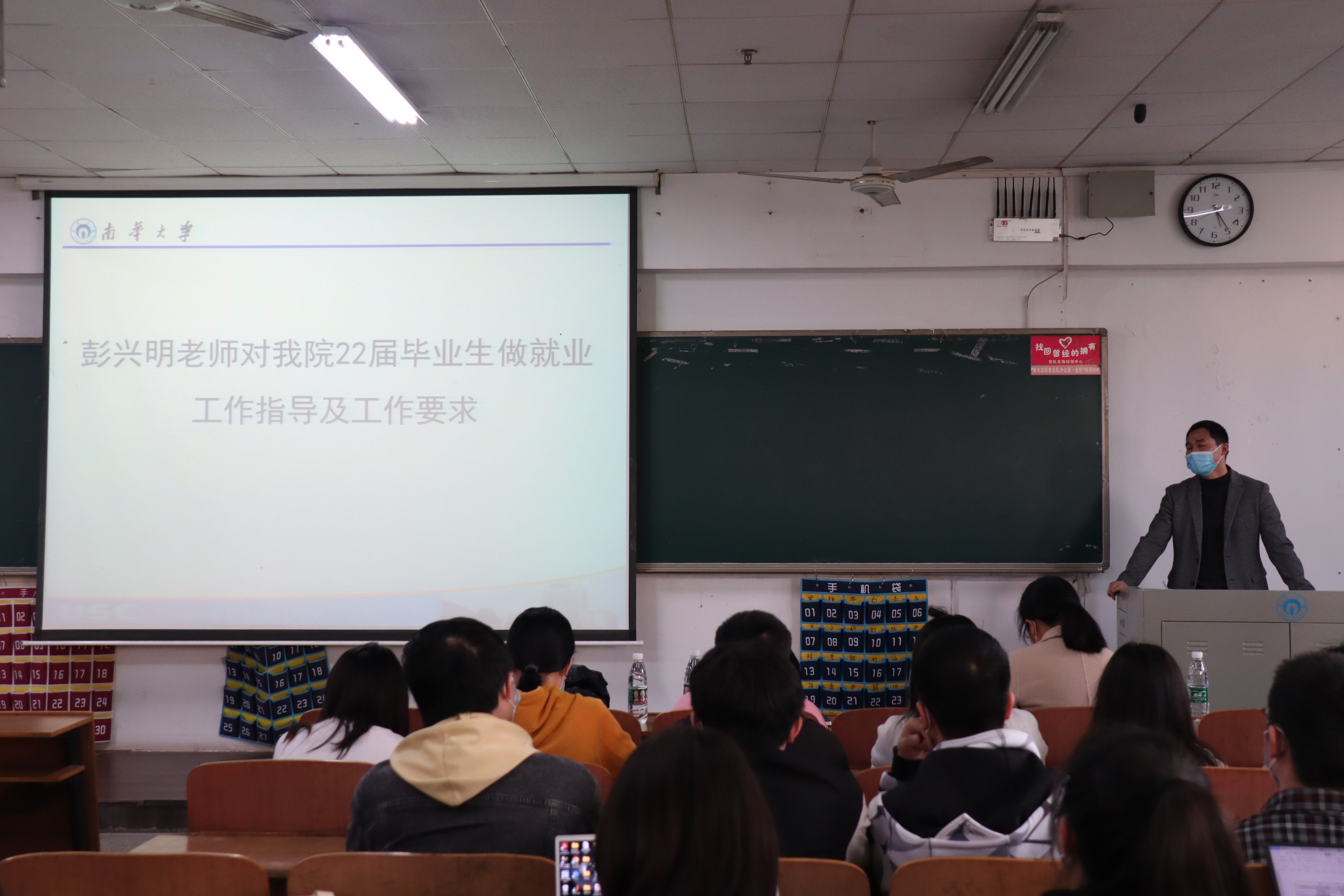 会议第二项,彭兴明老师对我院2022届毕业生就业工作进行指导,彭老师提醒各班干需督促好班级毕业生就业签约的后续工作,指出招聘会及招生优惠政策的时效性,希望各班干督促未就业的同学尽快就业,要求班长做好考研复试进度跟进并提醒考研二战的学生做好考虑。