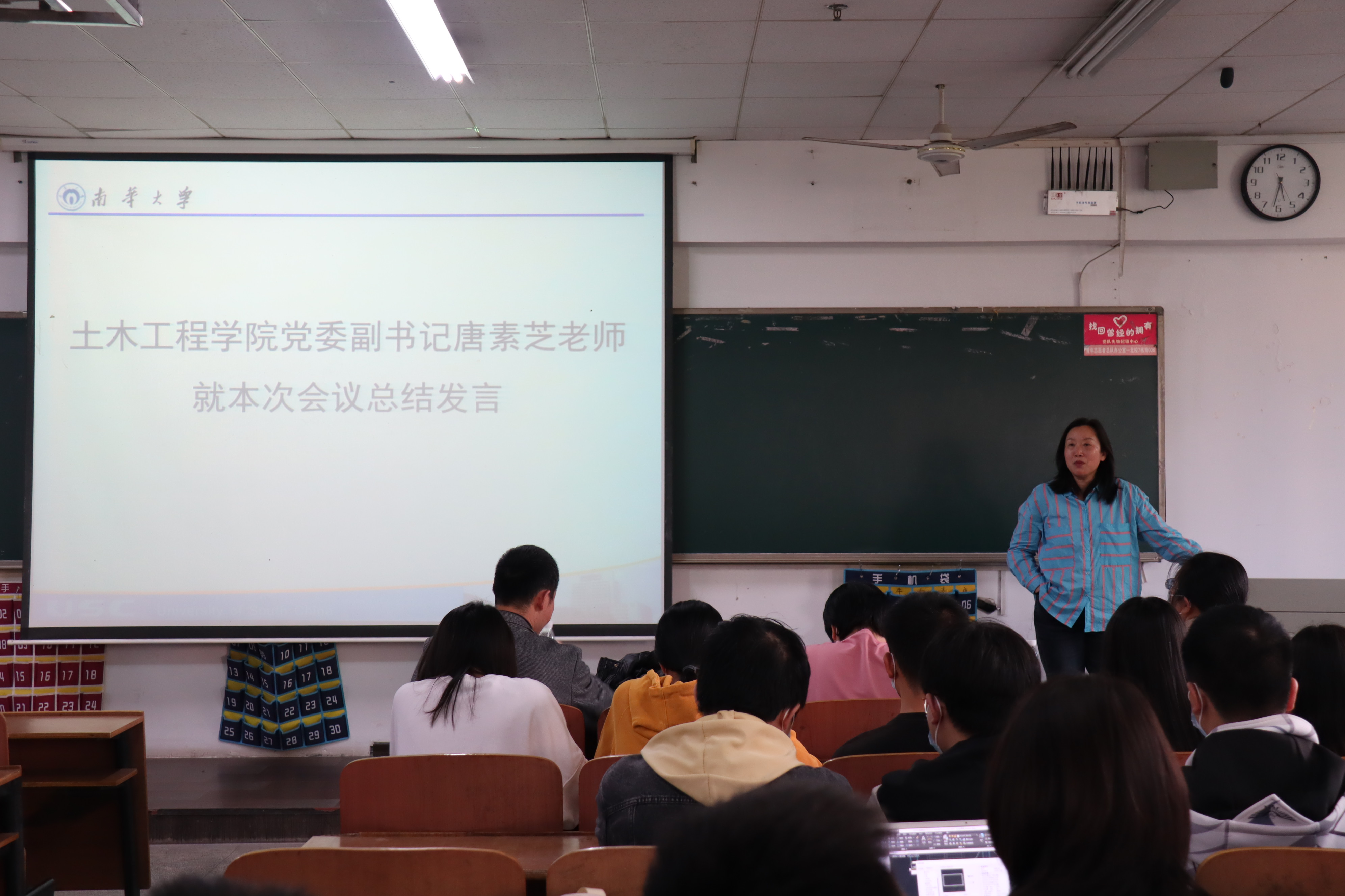 会议最后,唐素芝老师就本次会议进行总结发言。唐书记首先点明会议目的,以参军入伍的爱国情怀为切入点指出毕业生责任担当所在,她指出:“参军入伍未来有无限可能,我们来到世上不是来索取的,而是奉献的。”随后,她就毕业生就业工作问题指出各班班长应尽的责任义务,她指出,党员是宣传员、服务员,班长与党员应了解班级情况,帮扶班级同学。最后,唐书记希望大家要把握好机会,不要只认准考研一条路,要给自己做好定位,脚踏实地。