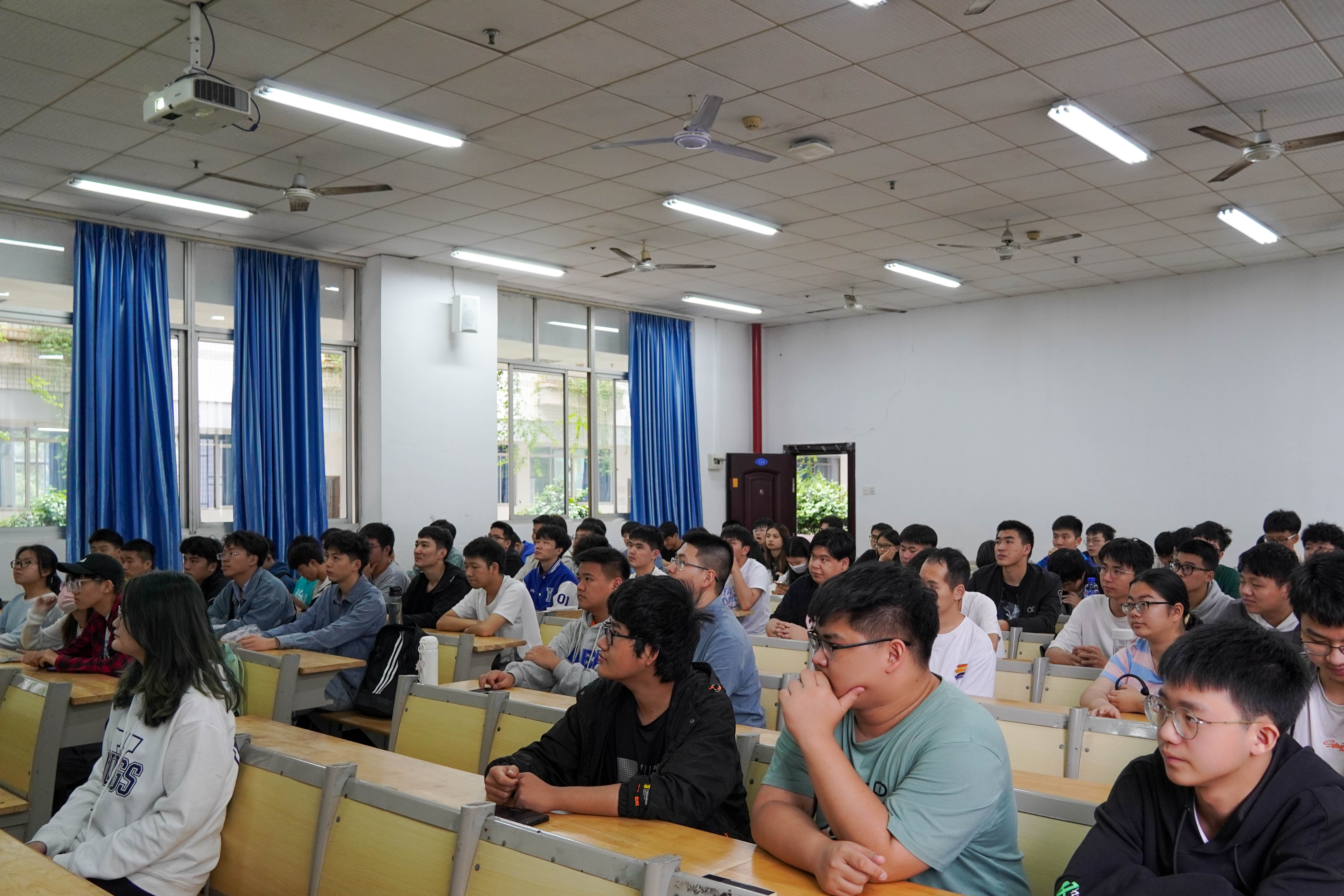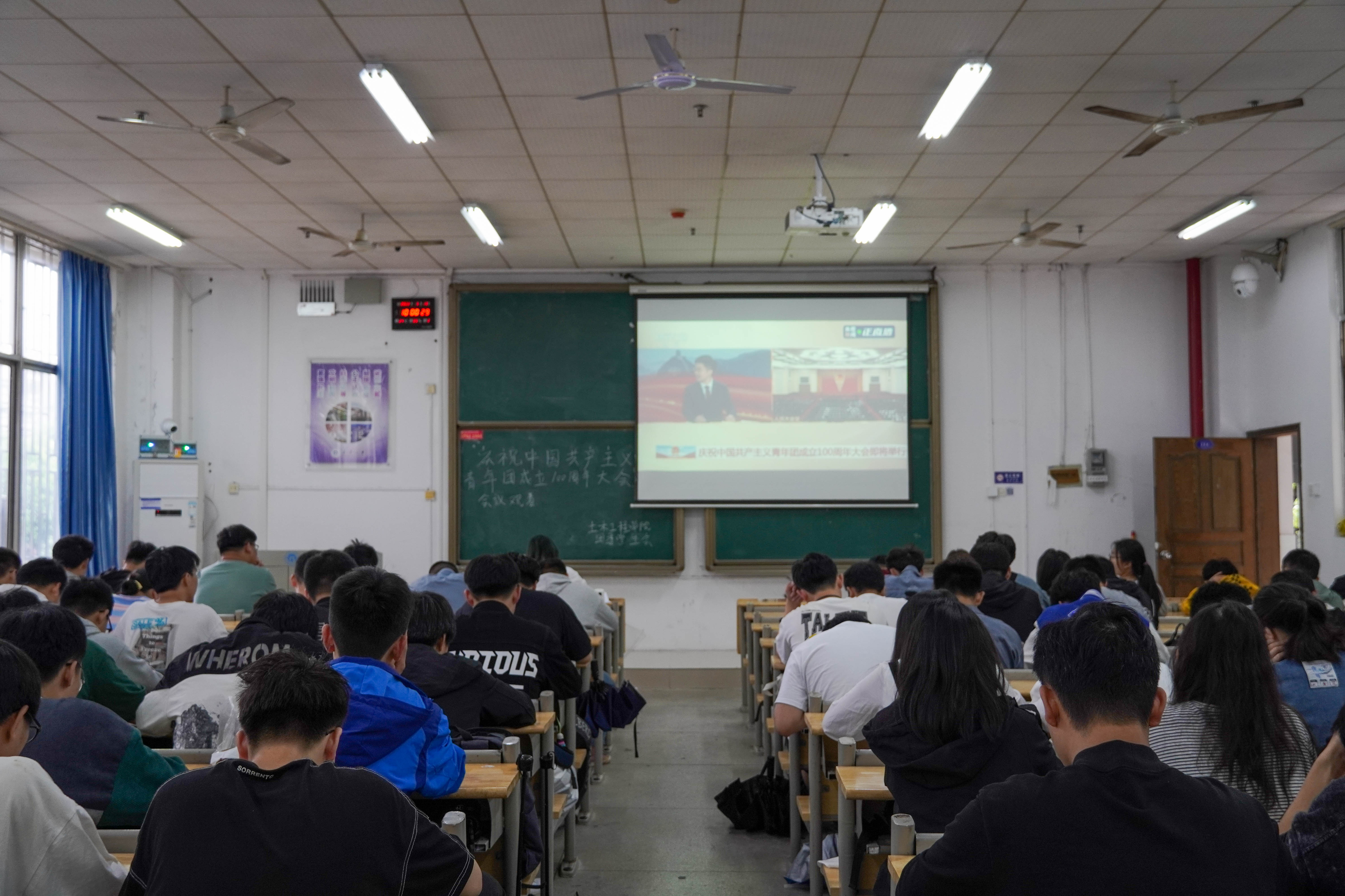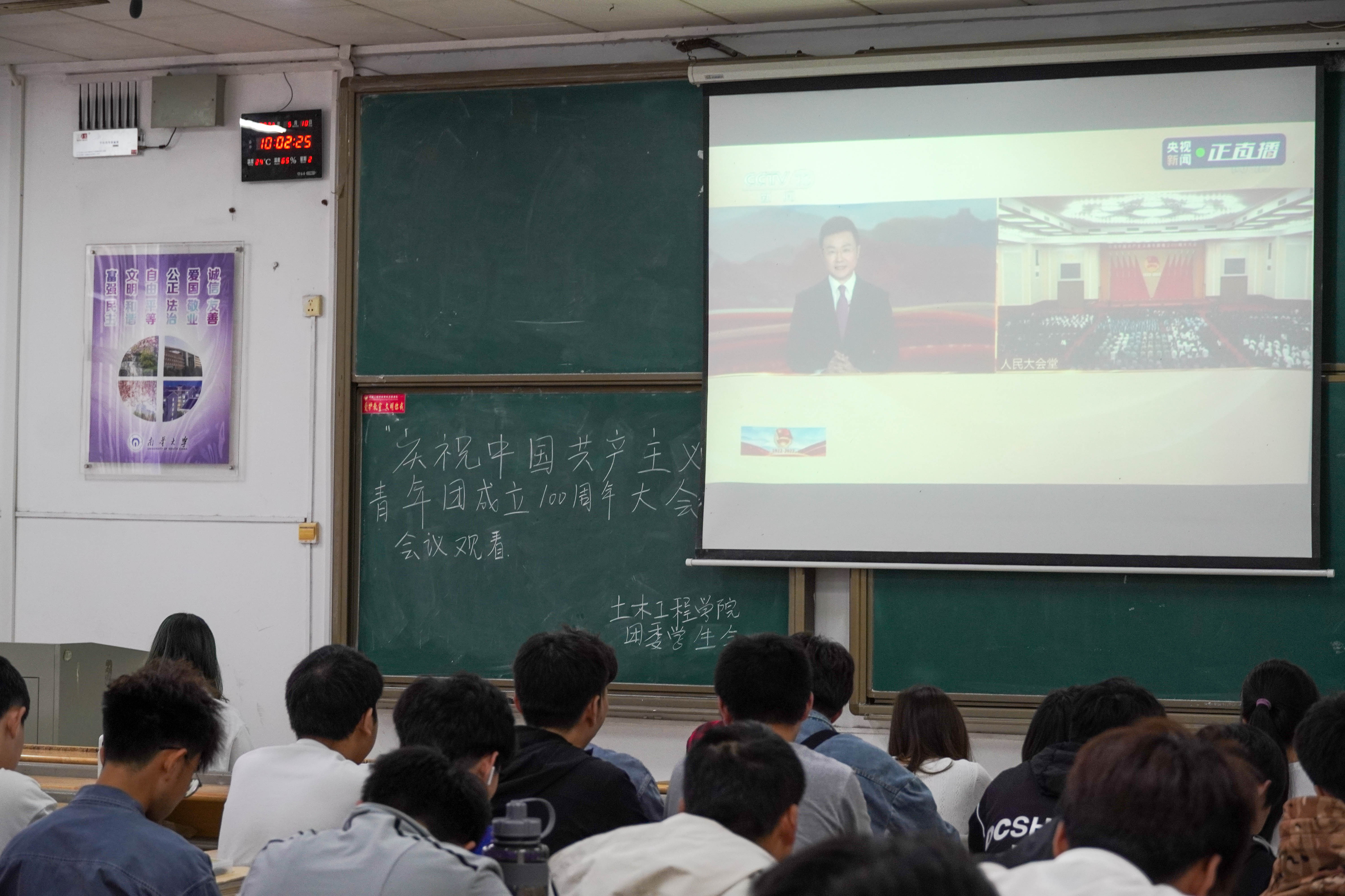 本次庆祝中国共产主义青年团成立100周年大会在北京人民大会堂隆重举行。庆祝大会上,共青团中央书记处第一书记贺军科发言,中华全国总工会党组书记、副主席、书记处第一书记陈刚代表人民团体发言。习近平总书记发表重要讲话,回顾了中国共产主义青年团跟党走、听党话的百年奋斗历程,为中国青年运动擘画了新的未来,为中国青年提出了奋进新时代的新要求、新期待。习近平总书记强调:“新时代的广大共青团员,要做理想远大、信念坚定的模范;要做刻苦学习、锐意创新的模范;要做敢于斗争、善于斗争的模范;要做艰苦奋斗、无私奉献的模范;要做崇德向善、严守纪律的模范。”现场观看直播实况的同学们认真专注,感触颇深。