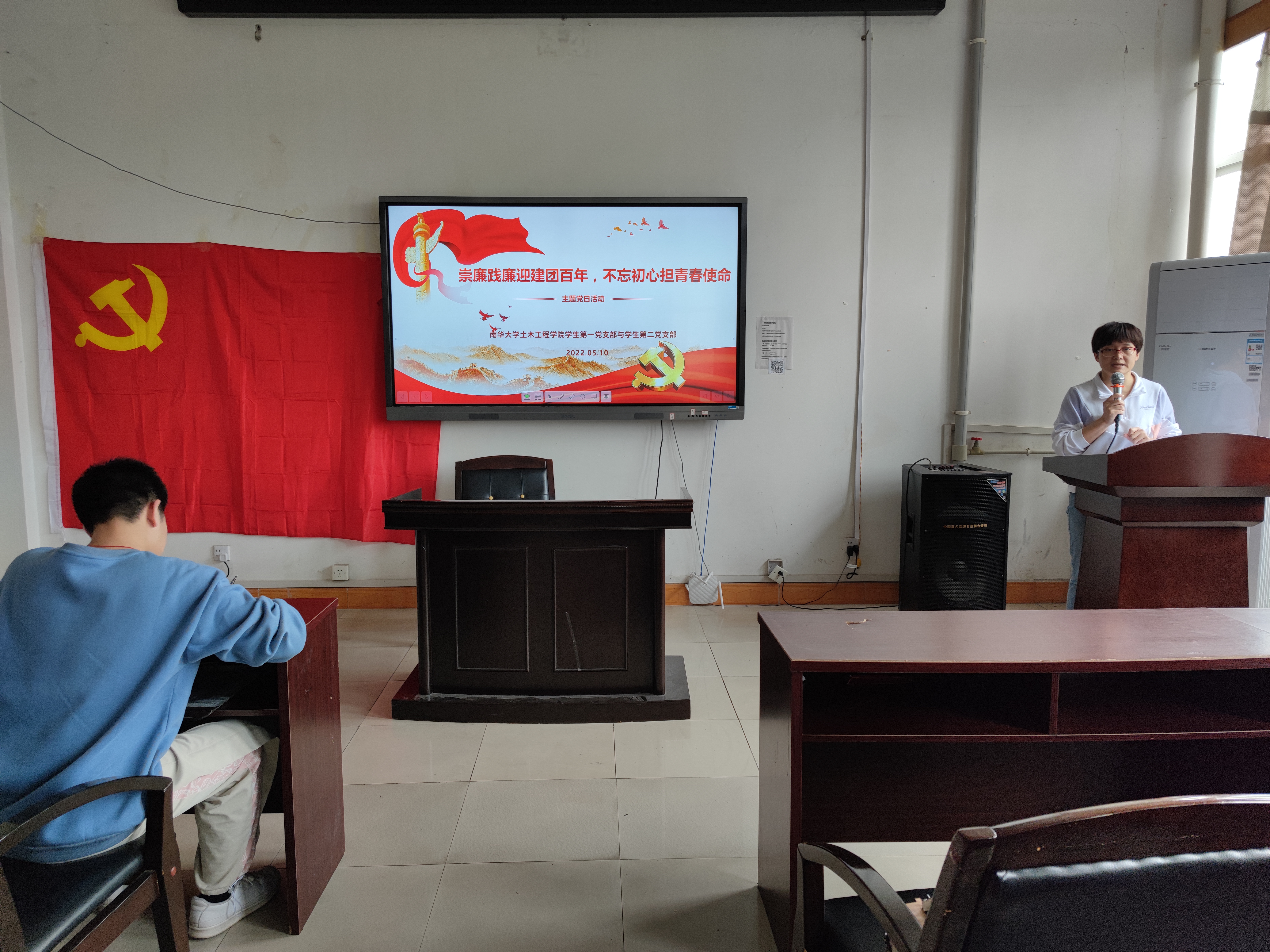 最后,学生第二党支部书记李翠新老师对活动进行总结:5月10日,是庆祝中国共产主义青年团成立100周年大会召开之日,也是学校5.10廉洁警示教育日,全体党员聆听了习近平总书记重要讲话,观看廉洁警示片,让廉洁意识入脑入心,涵养廉洁力量,希望大家将廉洁作为纪律、标尺、底线,树牢土木人的职业操守和责任意识,立足当下,不懈奋斗,坚定不移听党话,跟党走,勇担使命,把青春的光和热洒满祖国大地。