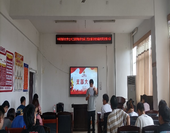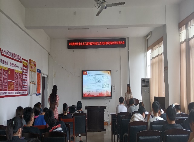 会议第一项,奏唱国际歌。礼毕,会议进行第二项,由黄书琪、卢嫚等6名同志依次就个人自身情况、对党的认识、入党动机等方面进行相关发言,并由其入党介绍人介绍其相关情况,对其能否吸收入党发表意见。随后,经支部大会讨论和正式党员投票表决,对该6名发展对象是否吸收入党进行投票表决。经投票决定,同意吸收黄书琪、卢嫚等6名同志为中共预备党员。