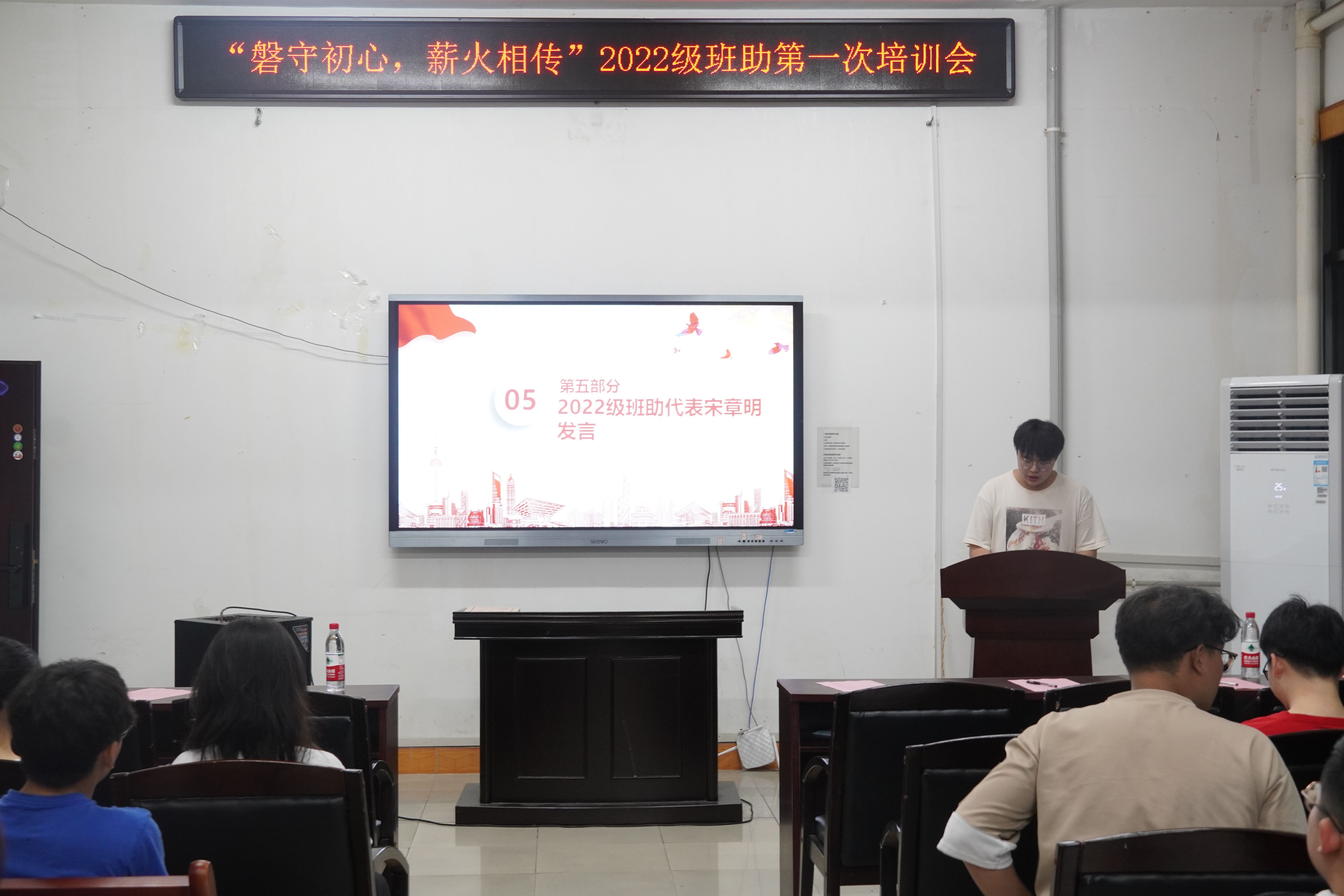 会议最后由2022级班助代表宋章明发言。他表示,将会认真做好班助工作,帮助新生更好地适应大学生活,真正做到薪火相传。最后,全体人员合影留恋。至此,此次班助培训会圆满结束。