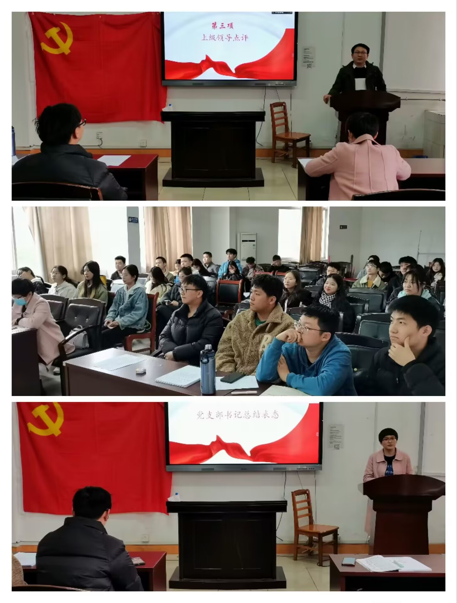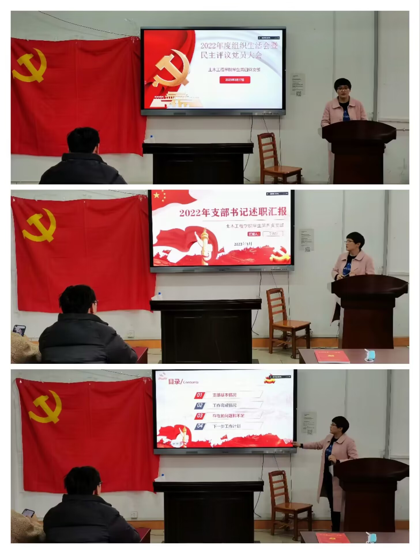 会上,支部书记李老师通报了本次组织生活会的前期准备工作情况和上年度组织生活会整改落实情况,并作2022年党建工作述职报告,接着代表支部委员会作对照检查,认真查摆工作中存在的问题,并结合党员们对支部工作的建议提出了整改措施。