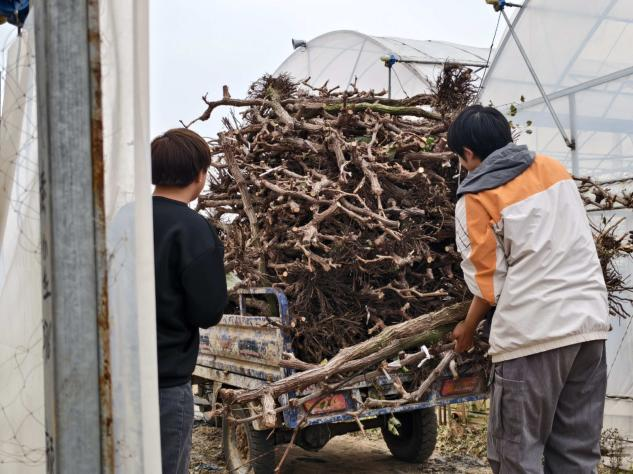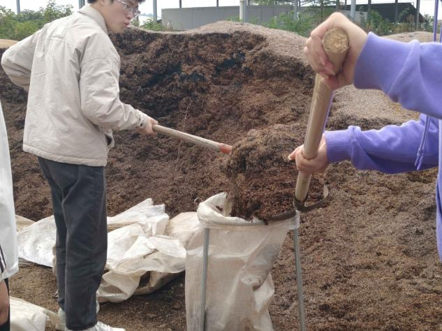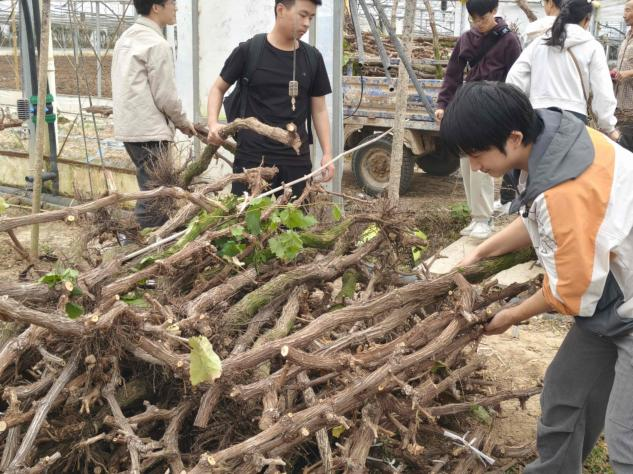 在基地工作人员的引导下,同学们参观了清花湾聚晴葡萄基地。通过工作人员的讲解,了解了葡萄的种植培育过程。在工作人员指导下,同学们参与了葡萄园的清园农作活动。大家分工协作,一部分同学开展葡萄藤枝条修剪、藤条收集与装车工作,一部分同学开展谷壳装袋工作。经园区人员介绍,清园工作是葡萄园种植生产周期中的重要一环,可以有效减少病虫害滋生,而修剪下来的葡萄枝条会进行集中粉碎处理,后期可以作为有机肥料还田,既能增加土壤有机质、改善土壤结构,又实现了农业资源的循环利用,秋收后的谷壳是农作物冬季保温的主要材料,既环保又实惠。同学们也从中体会了农业生产的辛苦劳作和深刻领会生态农业的发展理念。