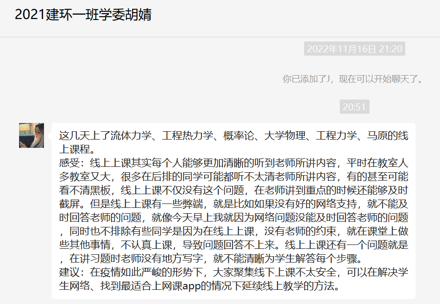 5、线下同线上不同感受:线上课同学们没有线下课认真,经常出现上课了人还没齐的情况,同时有时候由于网络原因回答问题也不能及时应答或者互动会滞后。