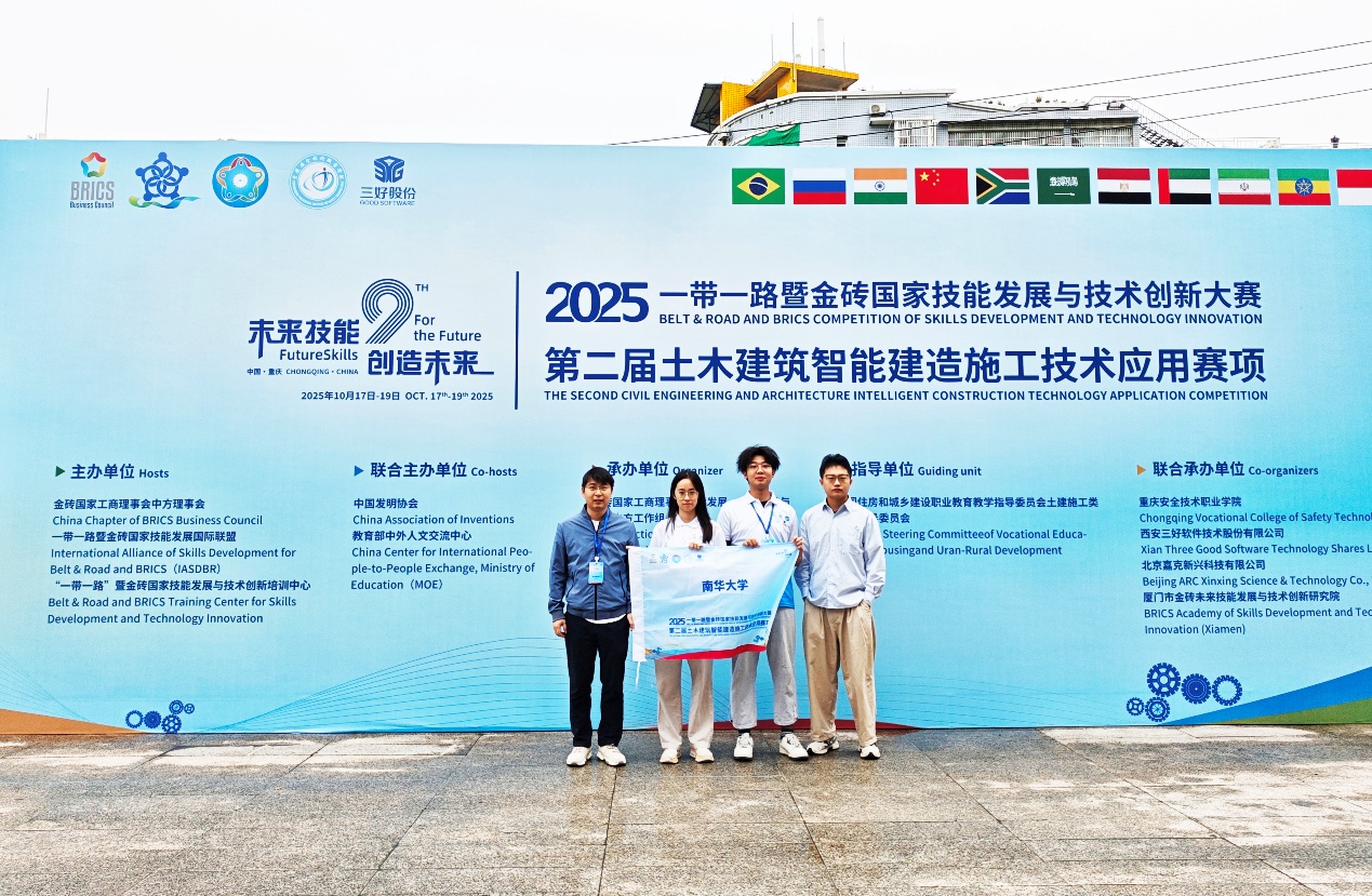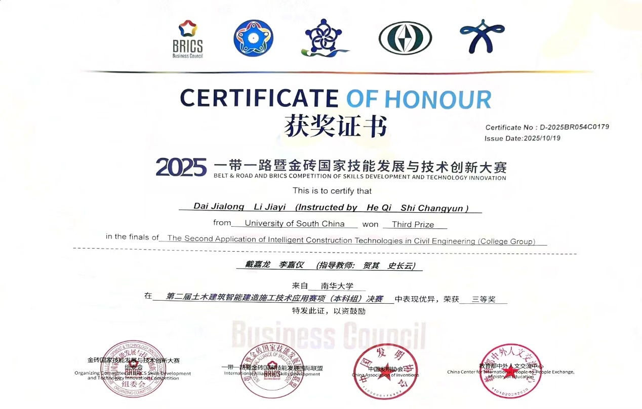 2025年10月17日至19日,2025“一带一路”暨金砖国家技能发展与技术创新大赛第二届土木建筑智能建造施工技术应用赛项全国决赛在重庆安全技术职业学院成功举办。在伟德国际victor1946智能建造与智慧交通专业贺其、史长云2位老师共同指导下,派出代表队参赛,在“土木建筑智能建造”赛项中脱颖而出,表现优异,获得三等奖(铜牌)。
