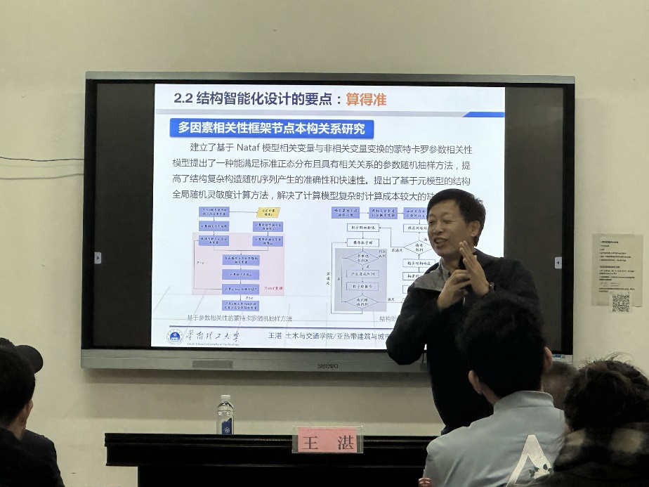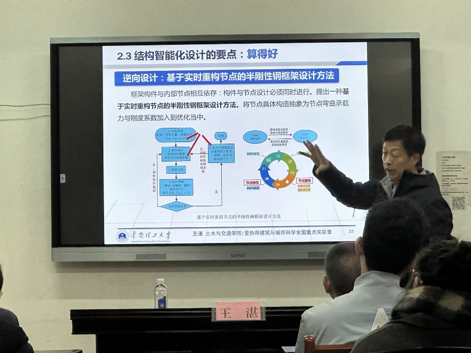 王教授以“结构智能化设计及其发展方向”为主题,从建筑结构设计领域行业现状,结构智能化设计的难点与要点,和面对未来的准备,这三个方面展开进行介绍。他首先指出结构设计目前存在的三大问题,并且对机器学习和优化算法展开分析。接着,王教授就他目前研究进展做了简单介绍,同时提出结构智能化设计的三大难点,也是三大要点,即算得准,算的快,算的好。最后,老师们与王教授对结构优化设计以及在具体工程和理论上各方面上进行交流讨论,同学还向王教授请教了结构健康检测未来的发展。会议结束后,同学们纷纷表示受益匪浅。