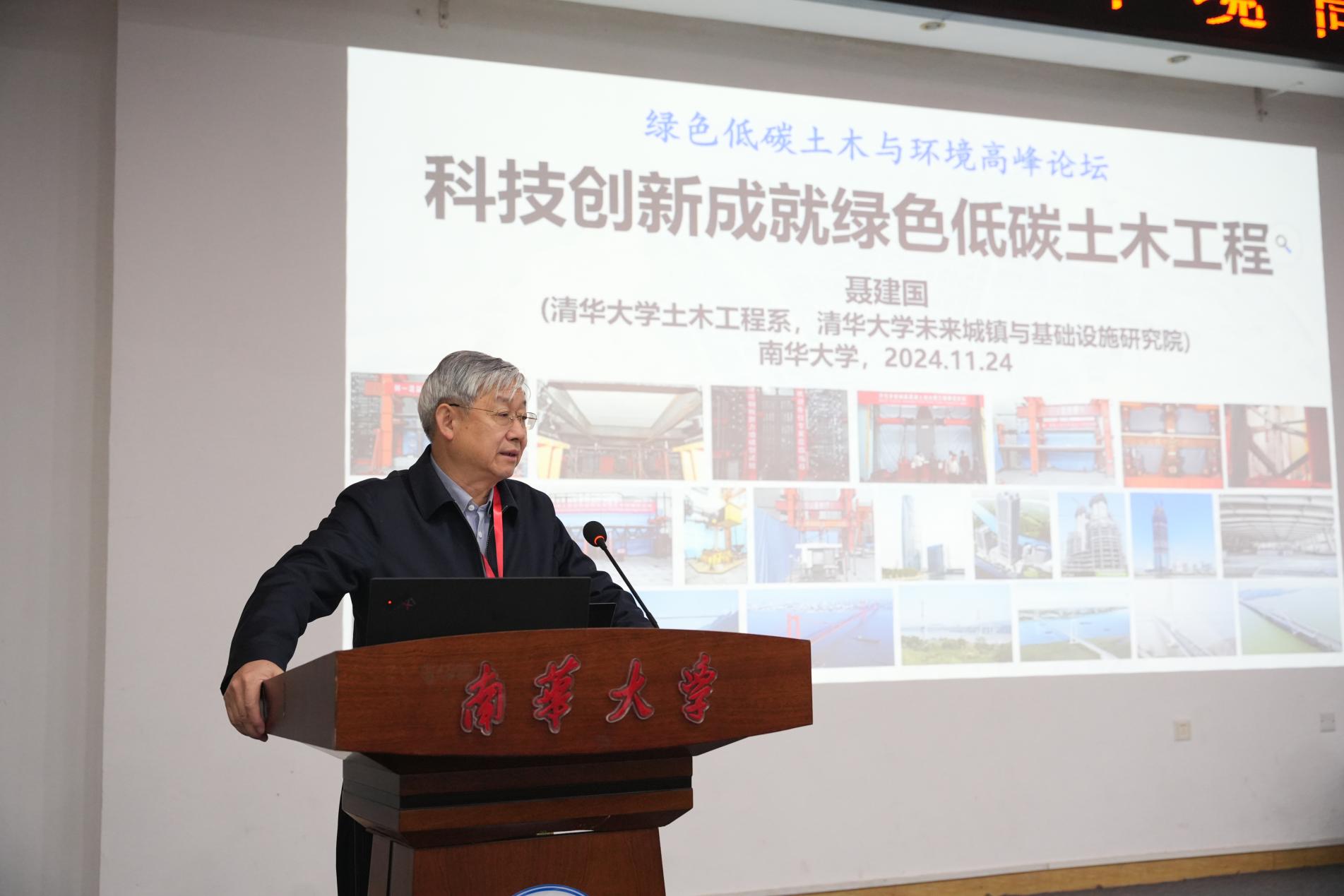 首先进行报告的是清华大学聂建国院士,聂院士以“科技创新成就绿色低碳土木工程”为主题,通过列举丰富的工程现场出现的安全状况,引出了传统建筑道桥等设施的结构选型难以满足现代城市发展需求的问题,强调了创新赋能绿色建筑结构的重要性,并表示工程师的设计思维要求变,创新要坚持不唯书、不唯上、不唯洋、不唯他、只唯实。