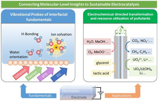 聚焦电化学界面基础科学及水环境污染控制中的应用,围绕电化学界面微观机制解析与污染物电化学转化调控两大核心方向,旨在通过发展原位界面表征新方法与污染物的电化学定向转化与资源回收,推动可持续能源转换和环境污染的绿色治理的理论基础与技术发展。